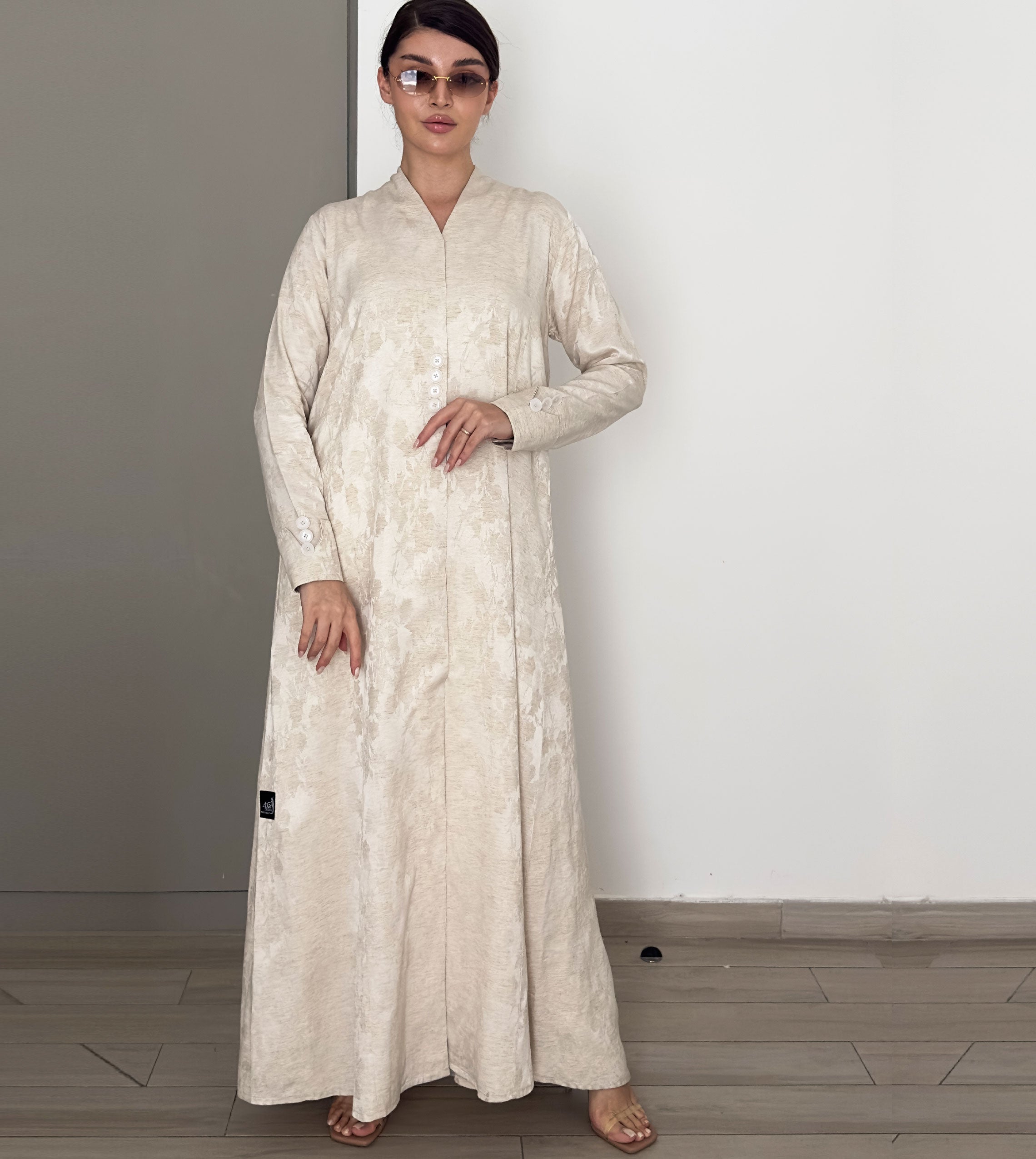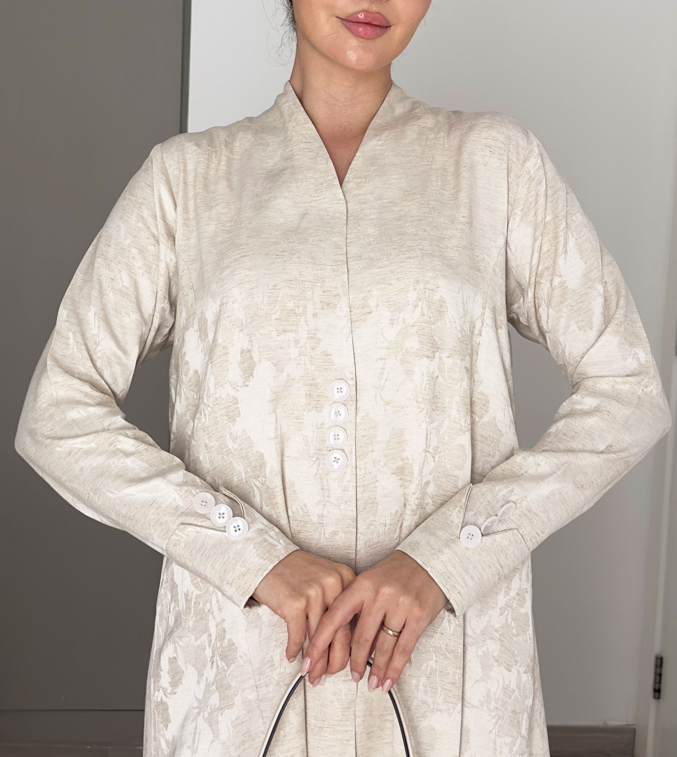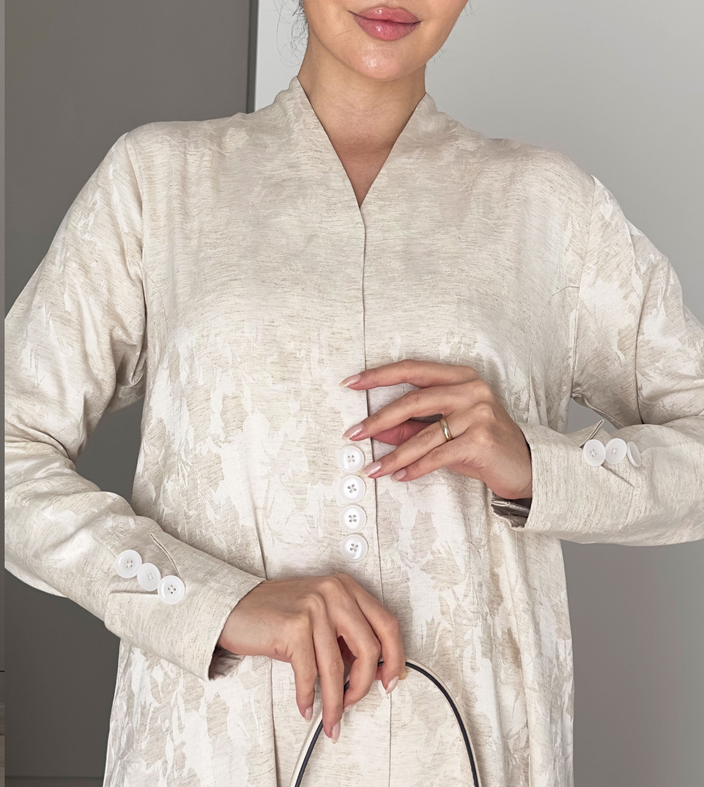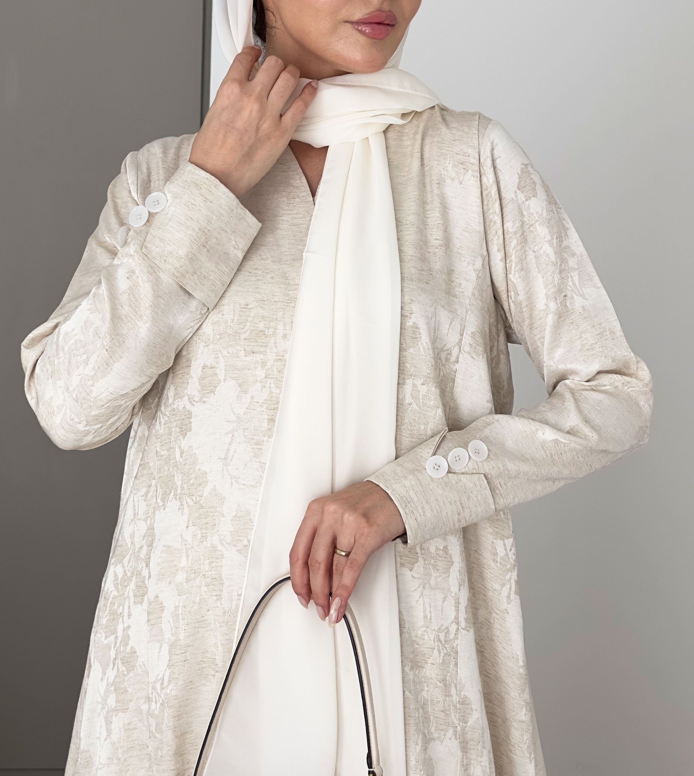 Open Abaya featuring a Printed Fabric design and classic button details Premium-quality, Modern and versatile, suitable for any occasion عباية مفتوحة بتصميم أنيق من قماش مطبوع، مزينة بأزرار كلاسيكية