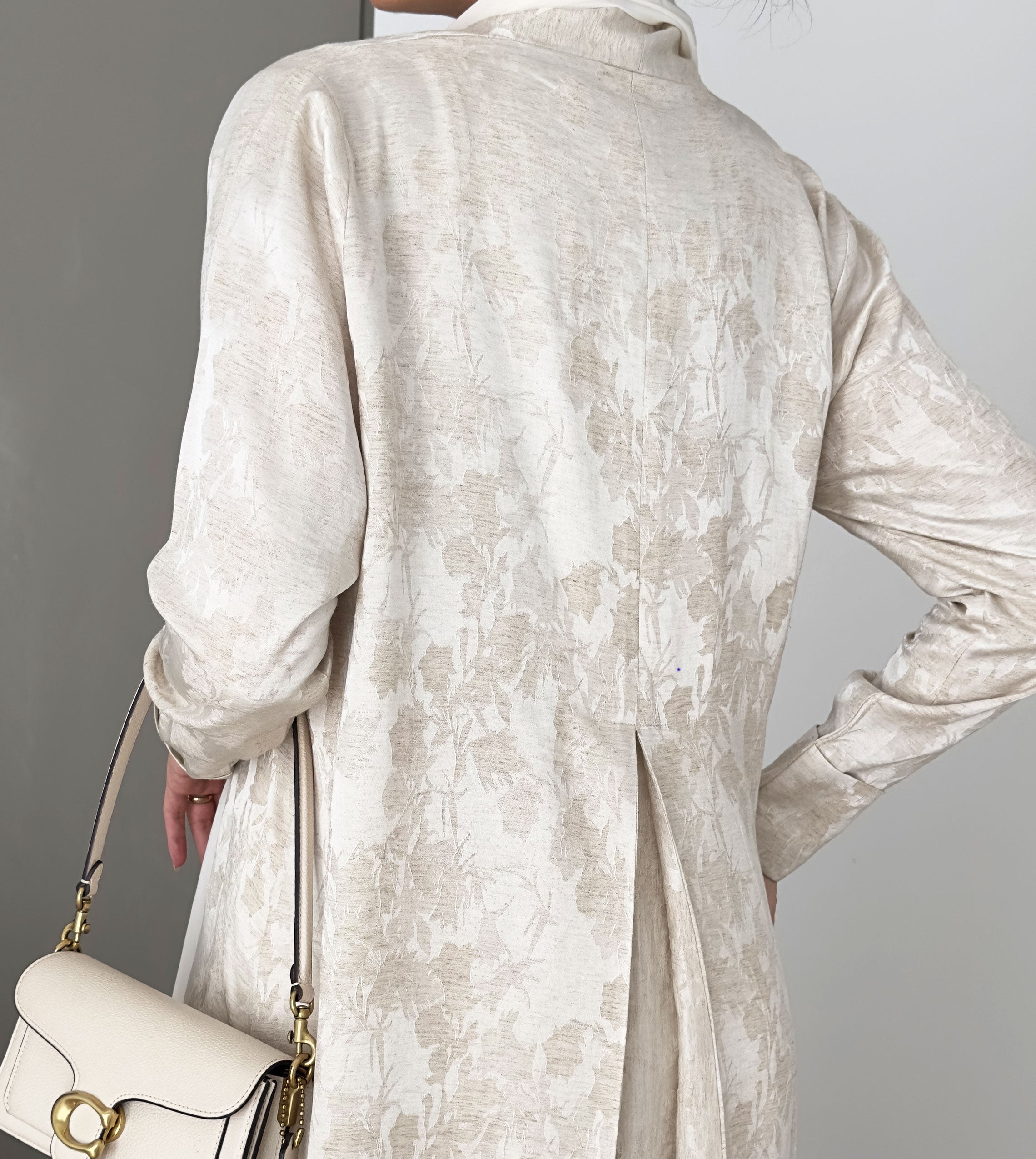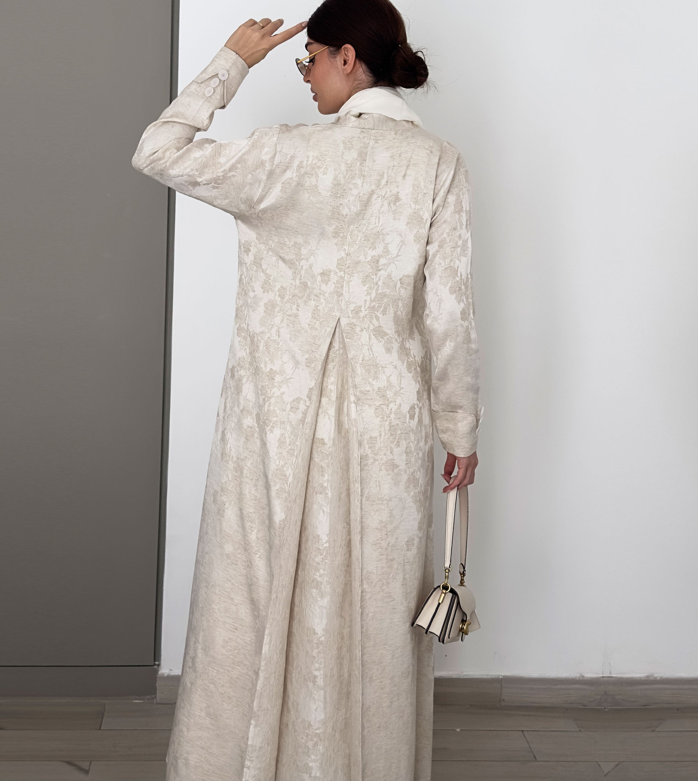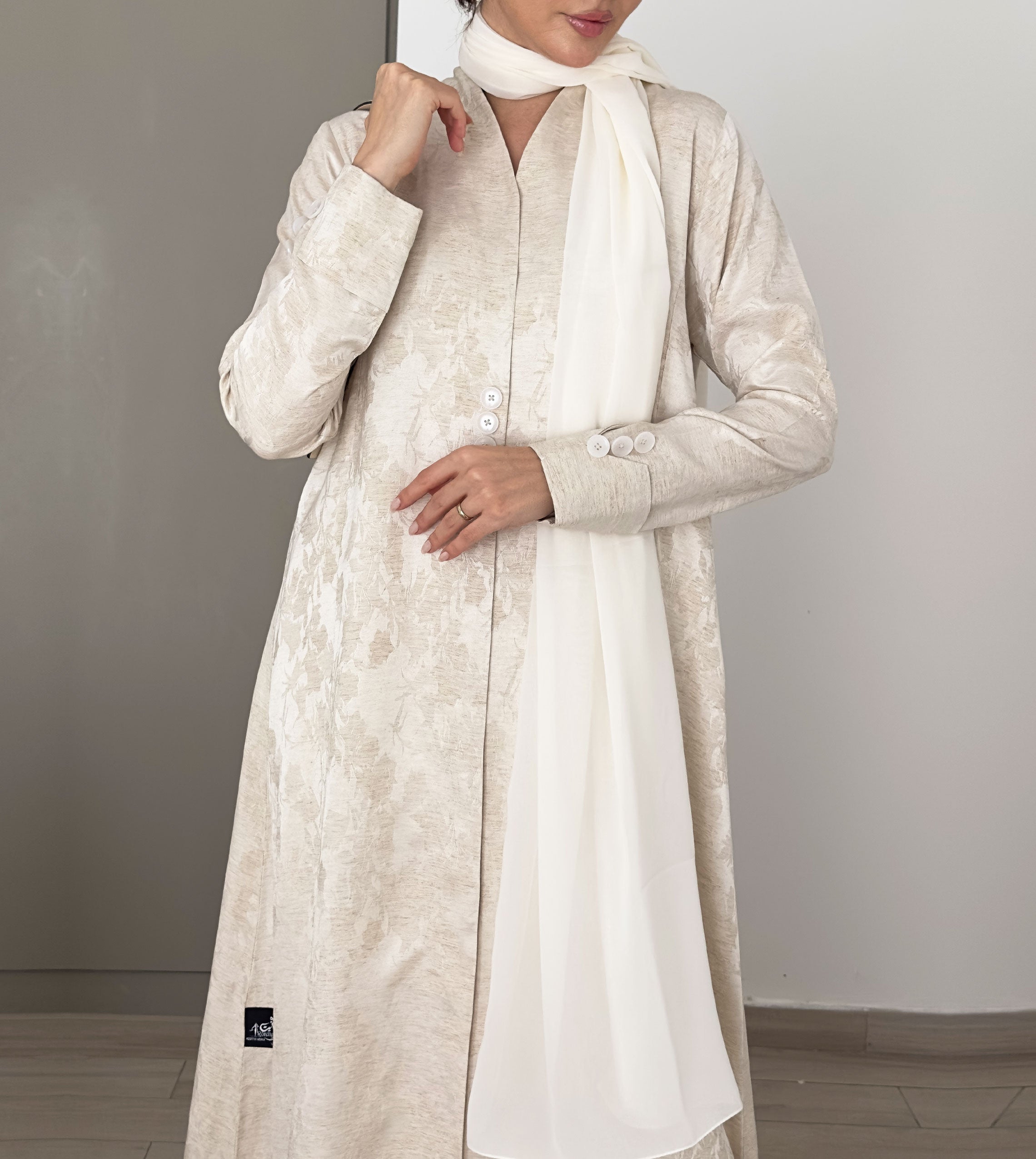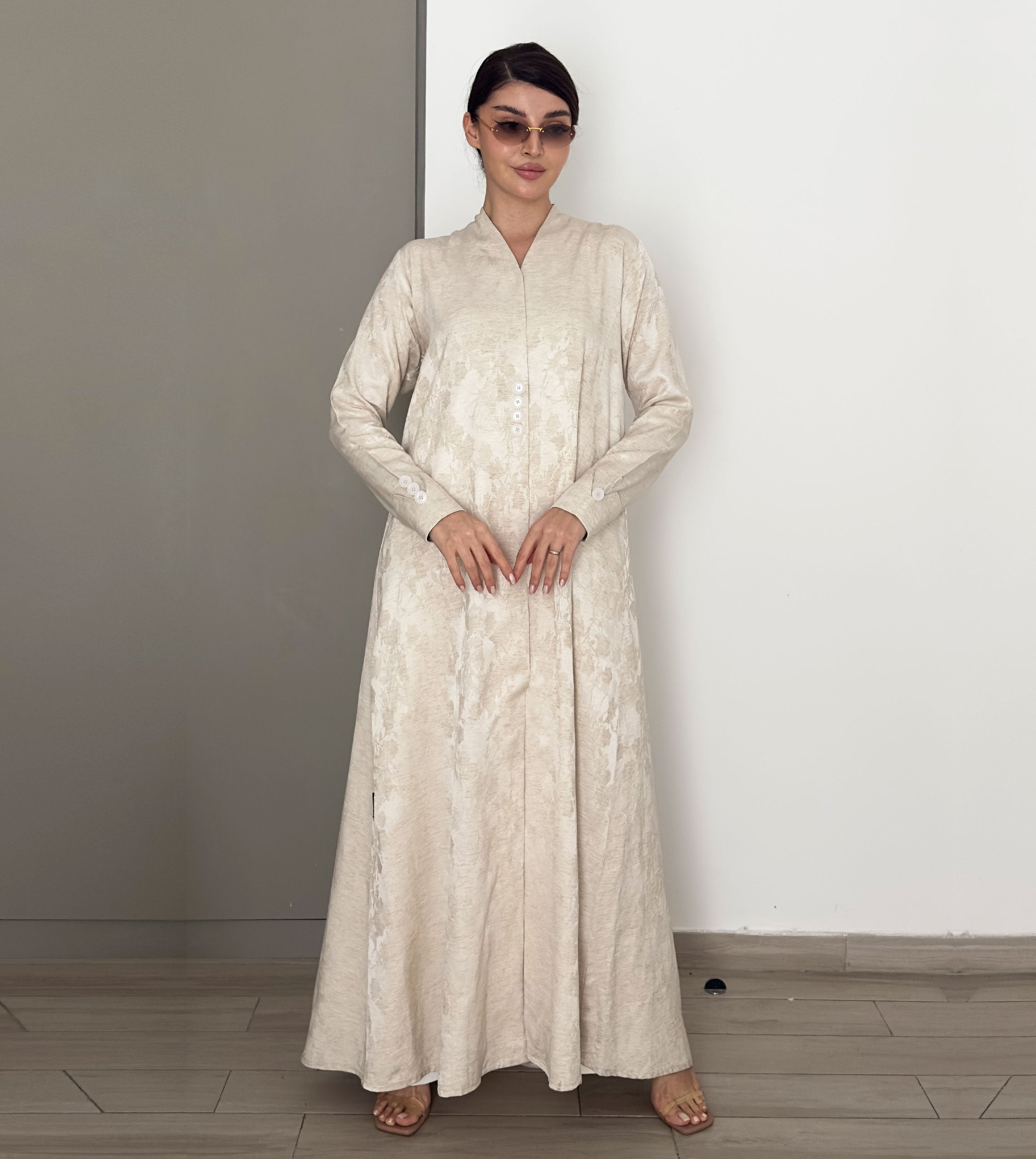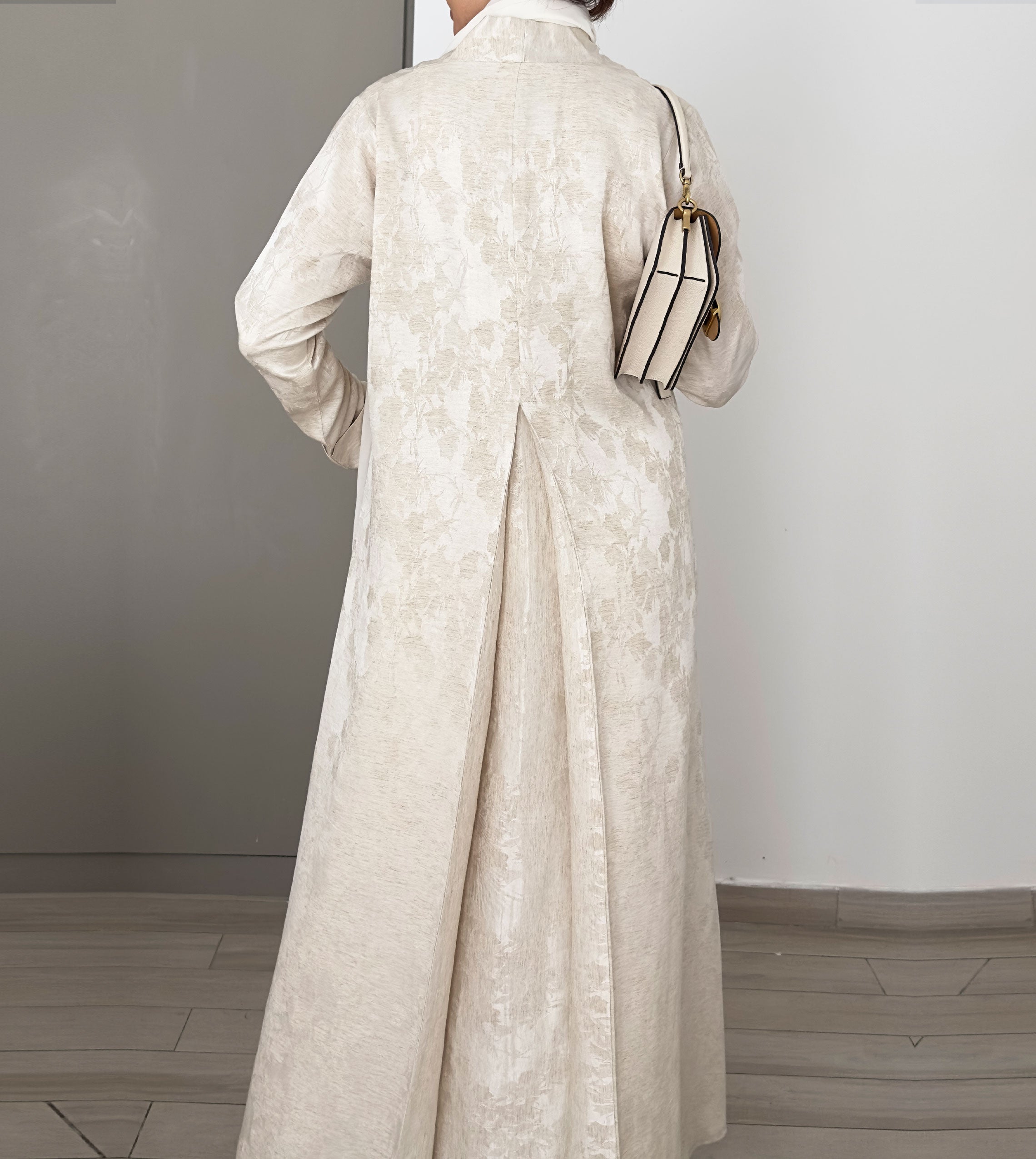 Open Abaya featuring a Printed Fabric design and classic button details Premium-quality, Modern and versatile, suitable for any occasion عباية مفتوحة بتصميم أنيق من قماش مطبوع، مزينة بأزرار كلاسيكية