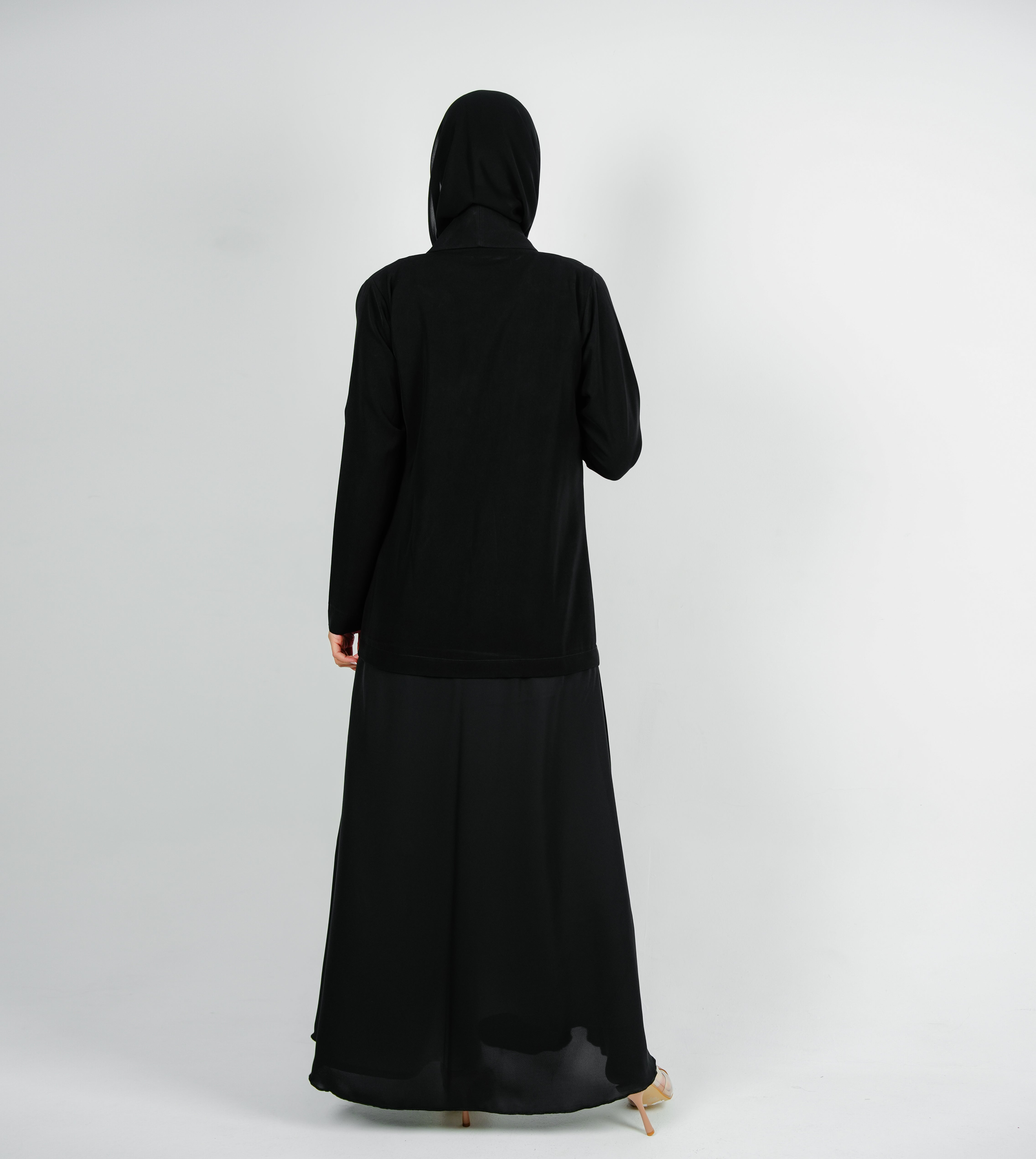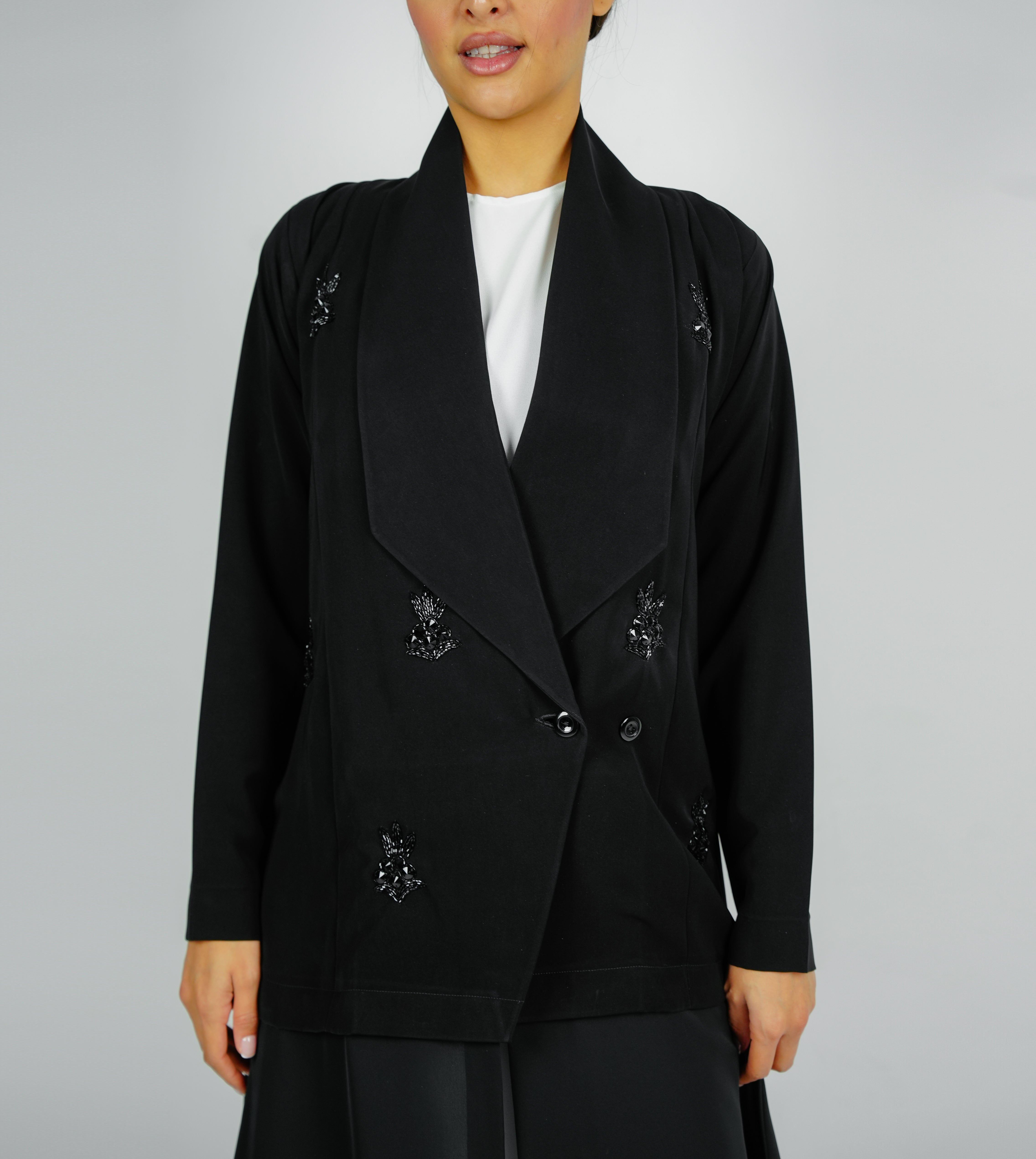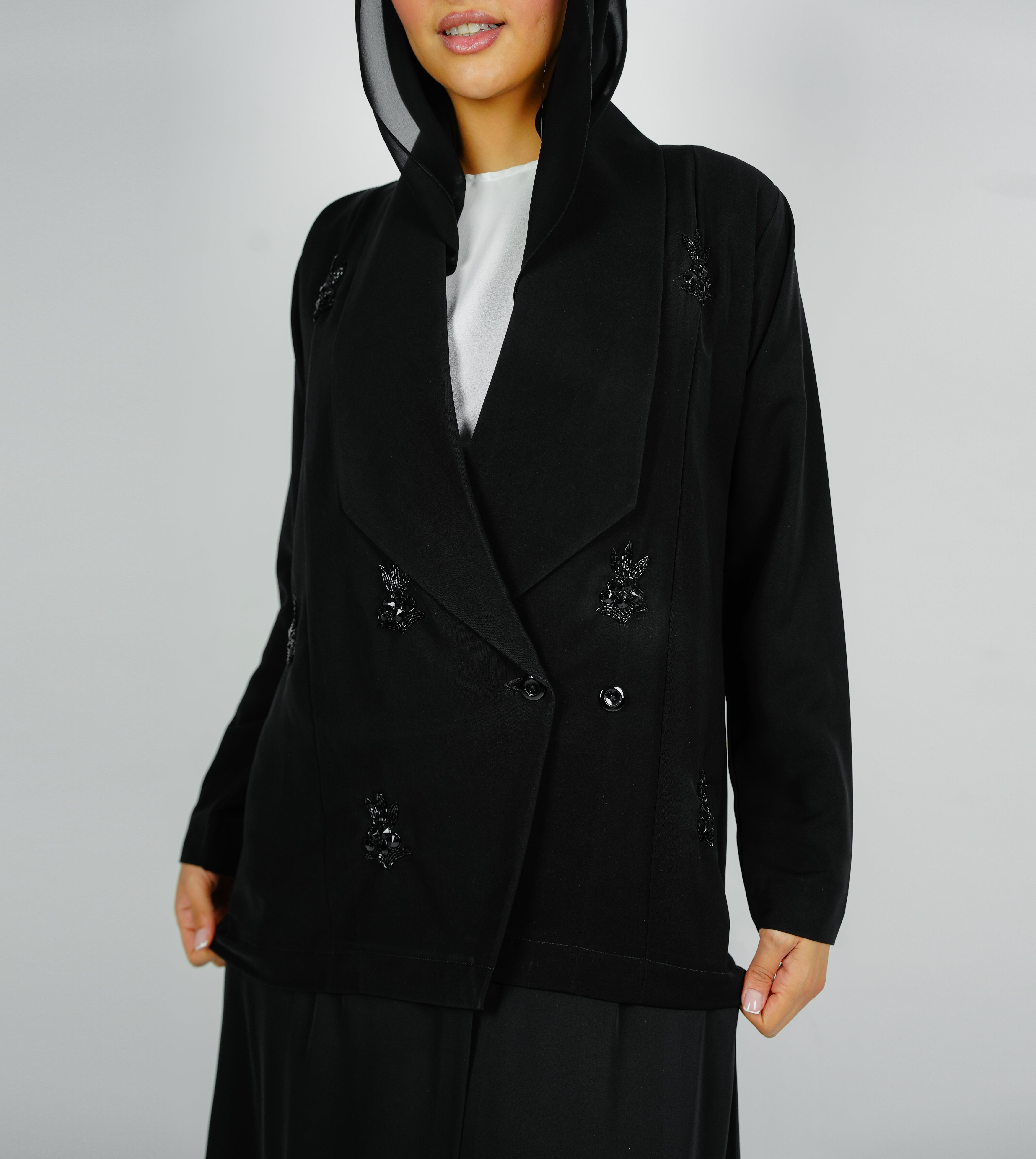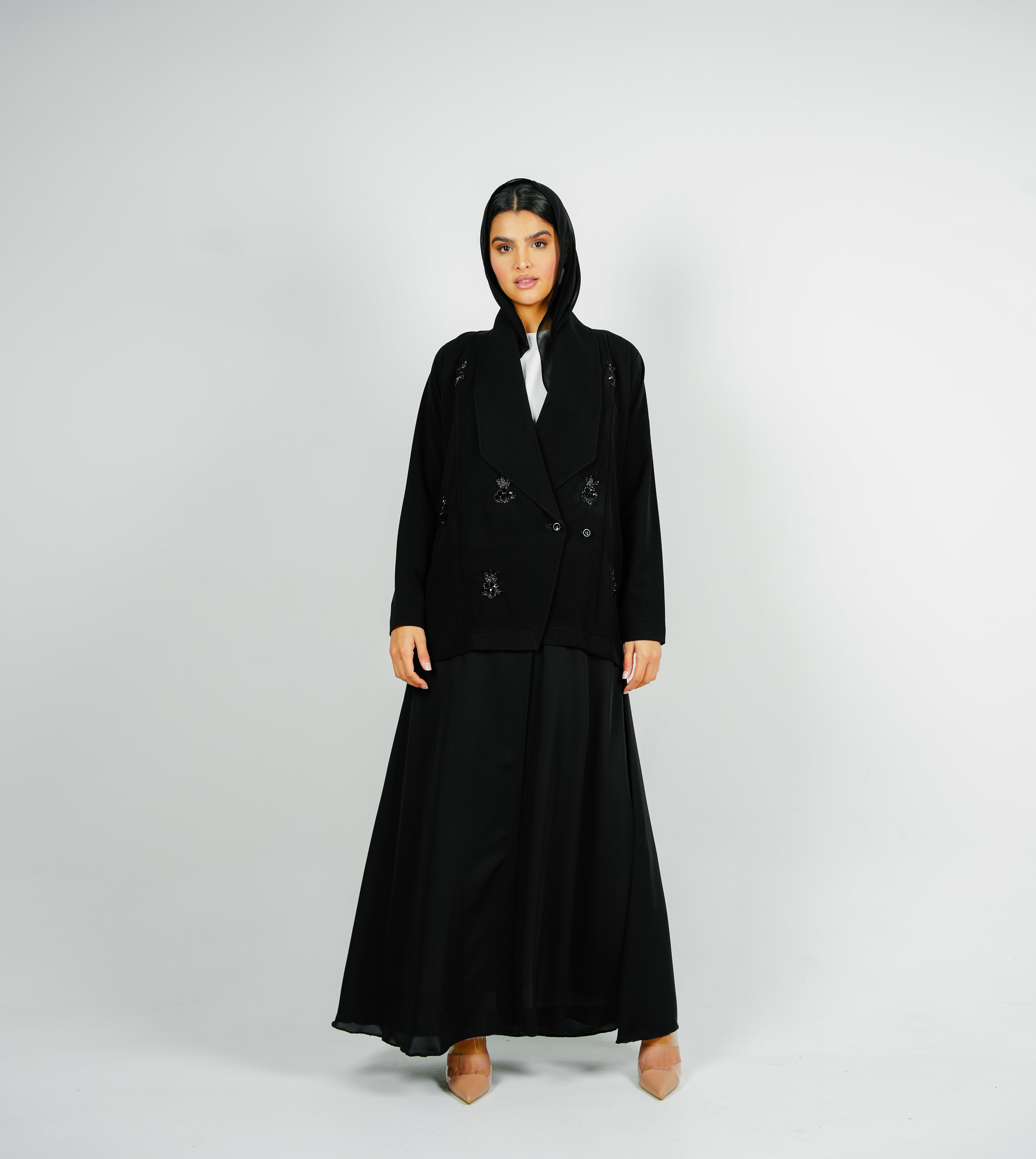 elegant and modern abaya with a blazer design embroidered with black stones, made from a blend of Nada and Barbie crepe fabrics عباية أنيقة وعصرية بتصميم بليزر مطرز باحجار سوداء بتصميم من مزيج الأقمشة ندى و باربي كريب