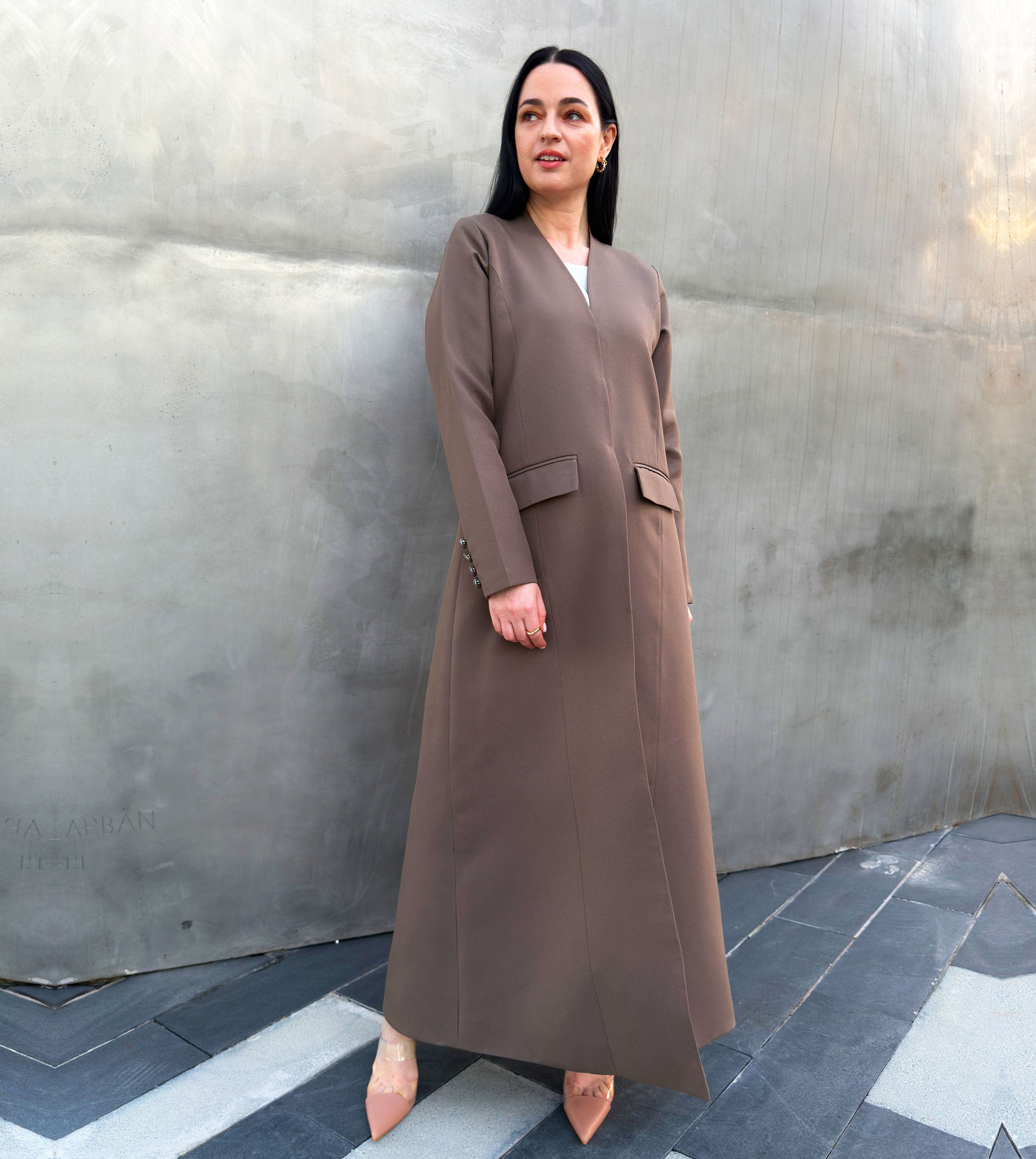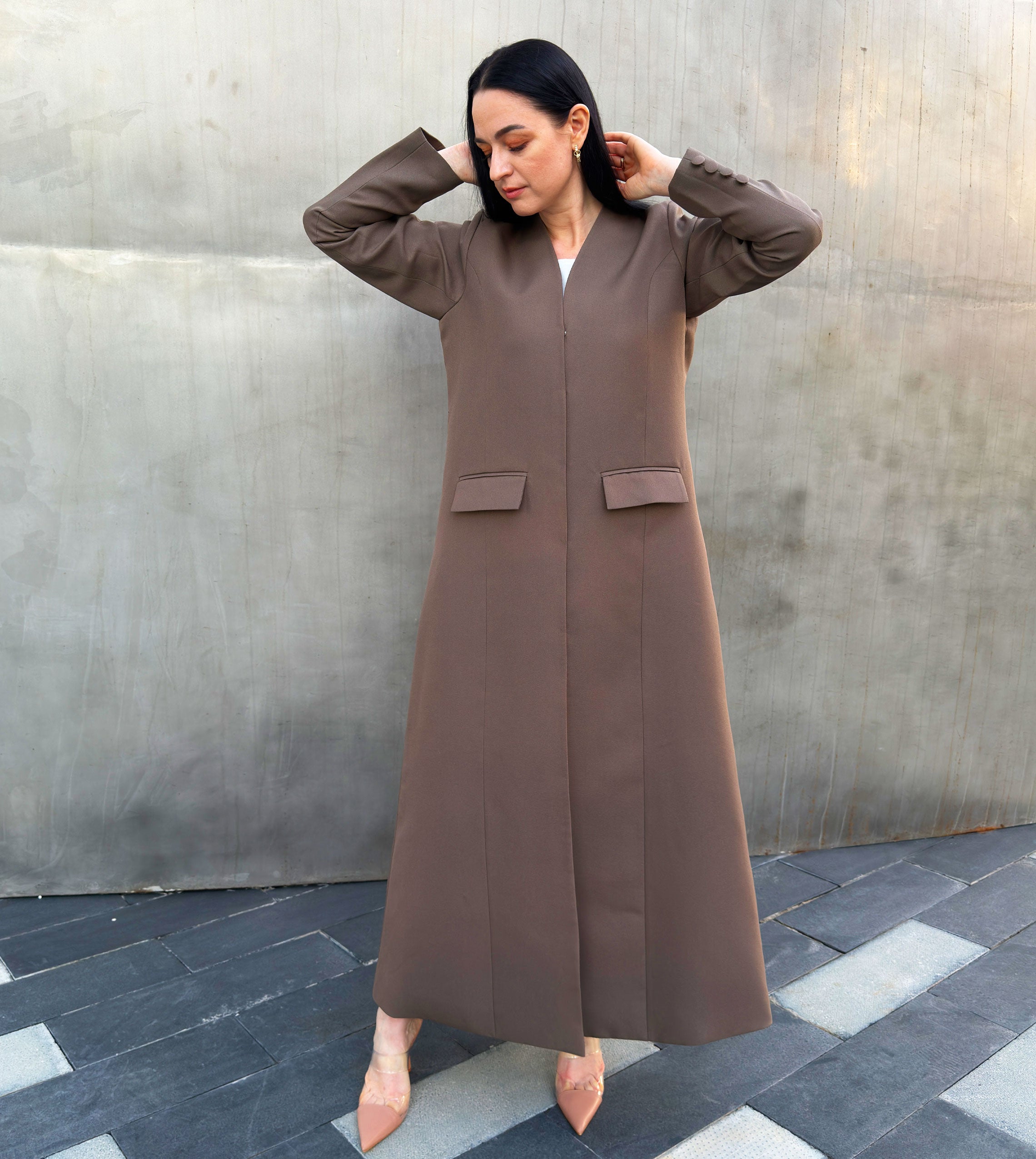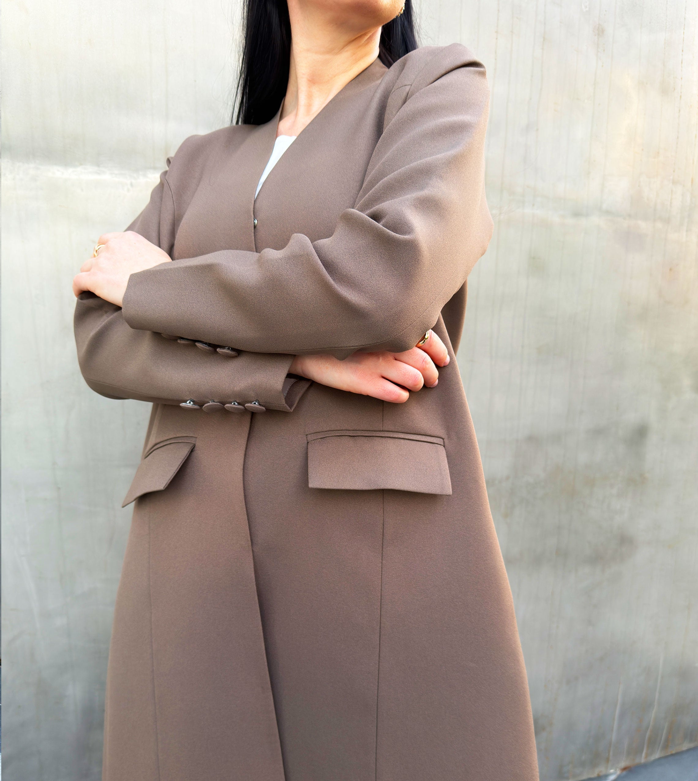 Luxury blazer-inspired with refined with pocket Coat, design for elegant warmth and timeless بليزر فاخرة مستوحاة من تصميم البليزر كوت مبطن، مزينة بجيوب أنيقة، مصممة لتوفير الدفء والأناقة الخالدة.