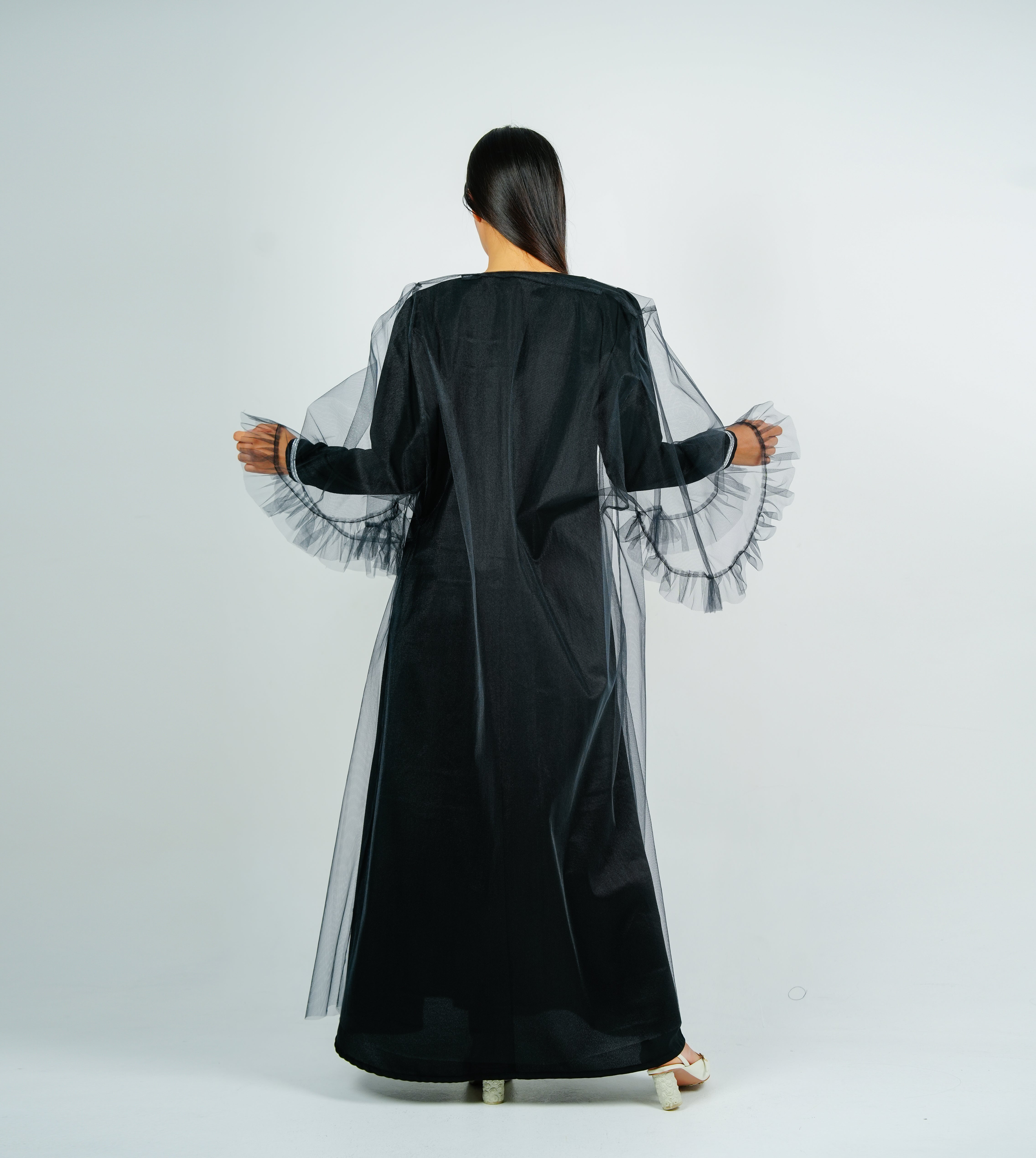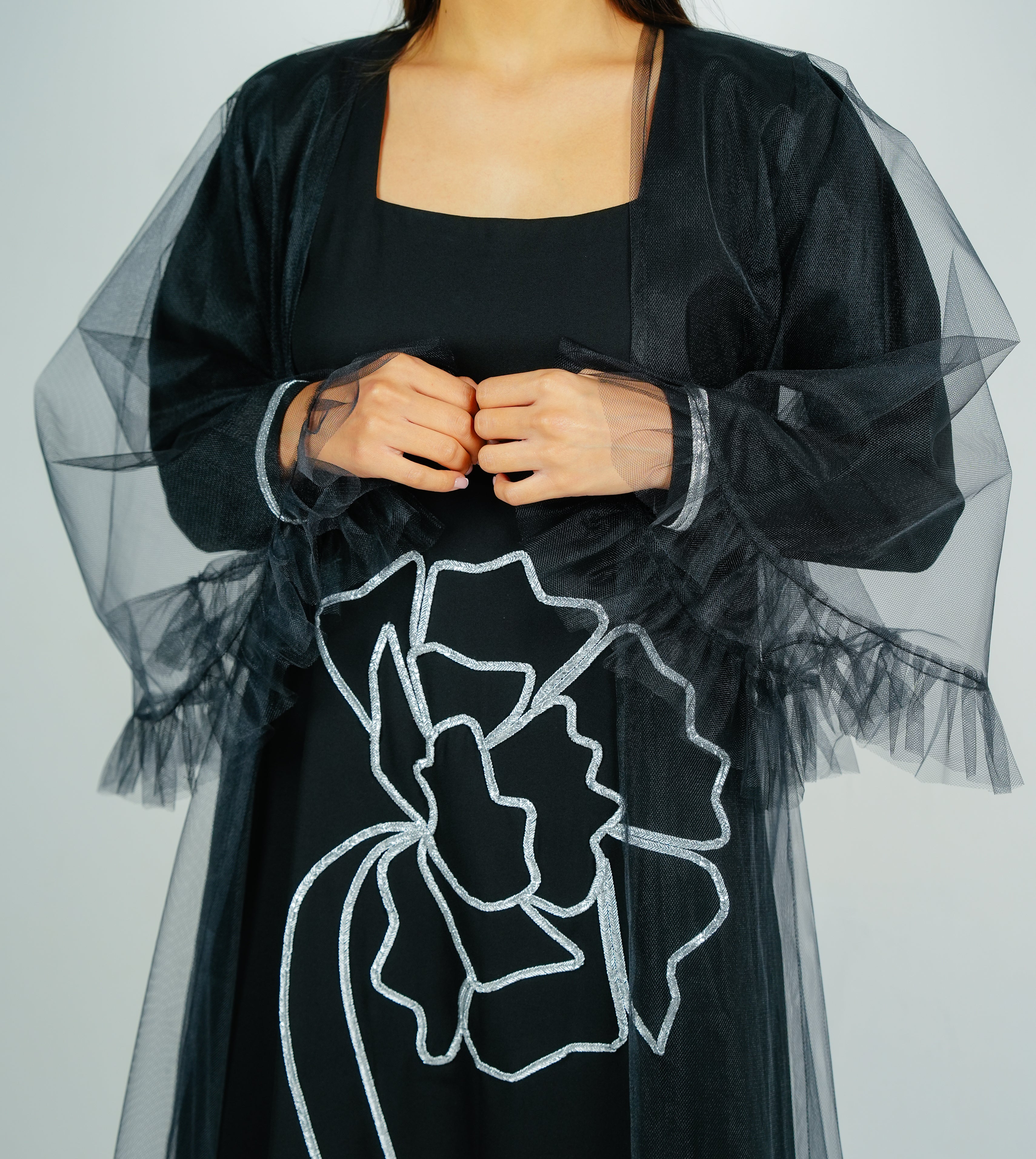جلابية مطرزة بقماش التلي الفضي وسترة من التول الشفاف بأكمام مكشكشة رقيقة جلابية بكيتجا تول شفافة فاخرة وأكمام مكشكشة. تطريز فضي جميل على التأسيس مثالي لشهر رمضان والعيد والمناسبات الخاصة، أنيق وأنثوي لشهر رمضان والعيد والمناسبات الخاصة، وأنثوية
