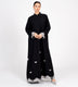 عباية سوداء تصميم بأكمام مطاطية مع تطريز يدوي بيج وقطع لؤلؤ + حزام عباية بيضاء بأكمام مطاطية مع تطريز يدوي ولؤلؤ + حزام