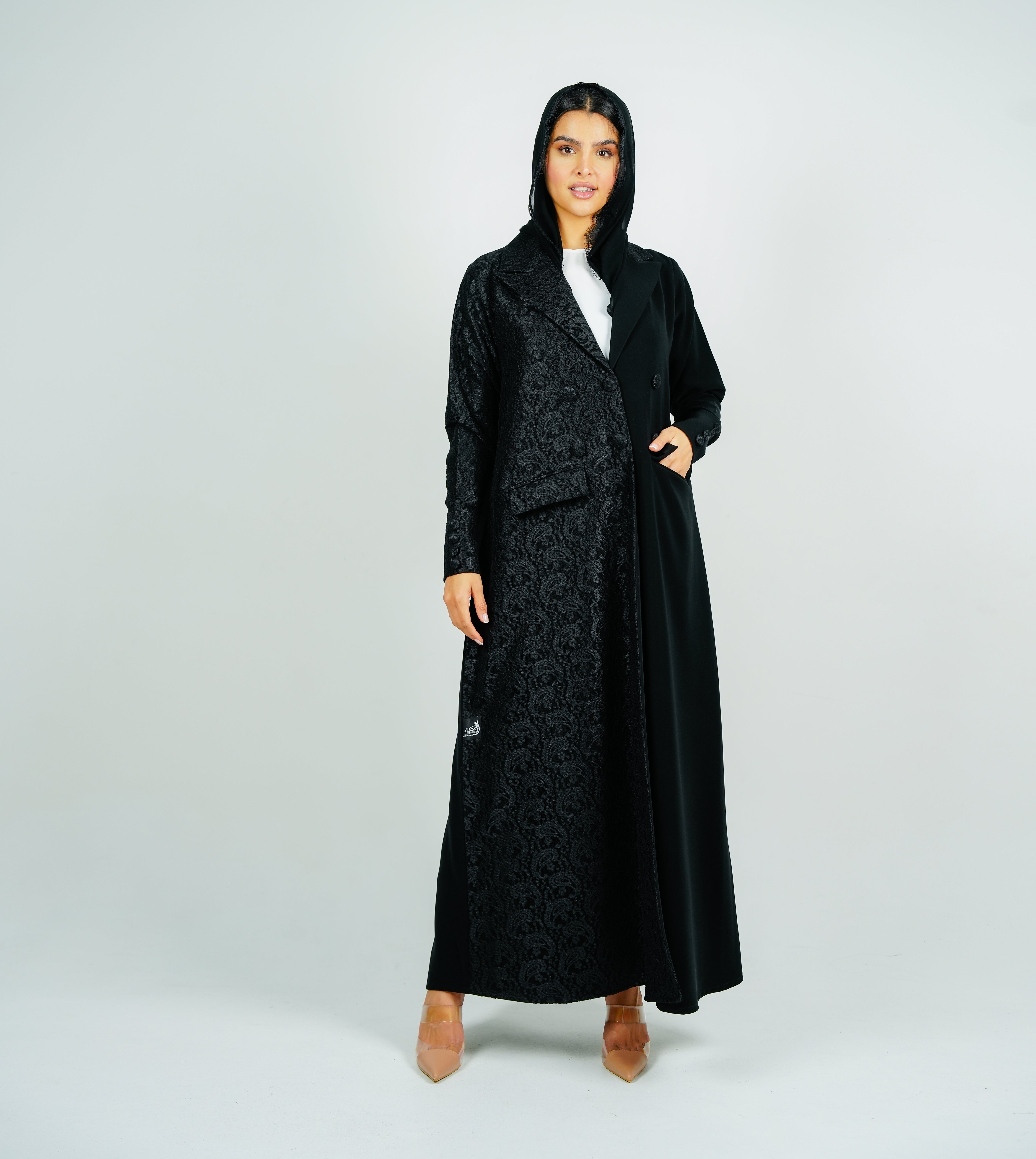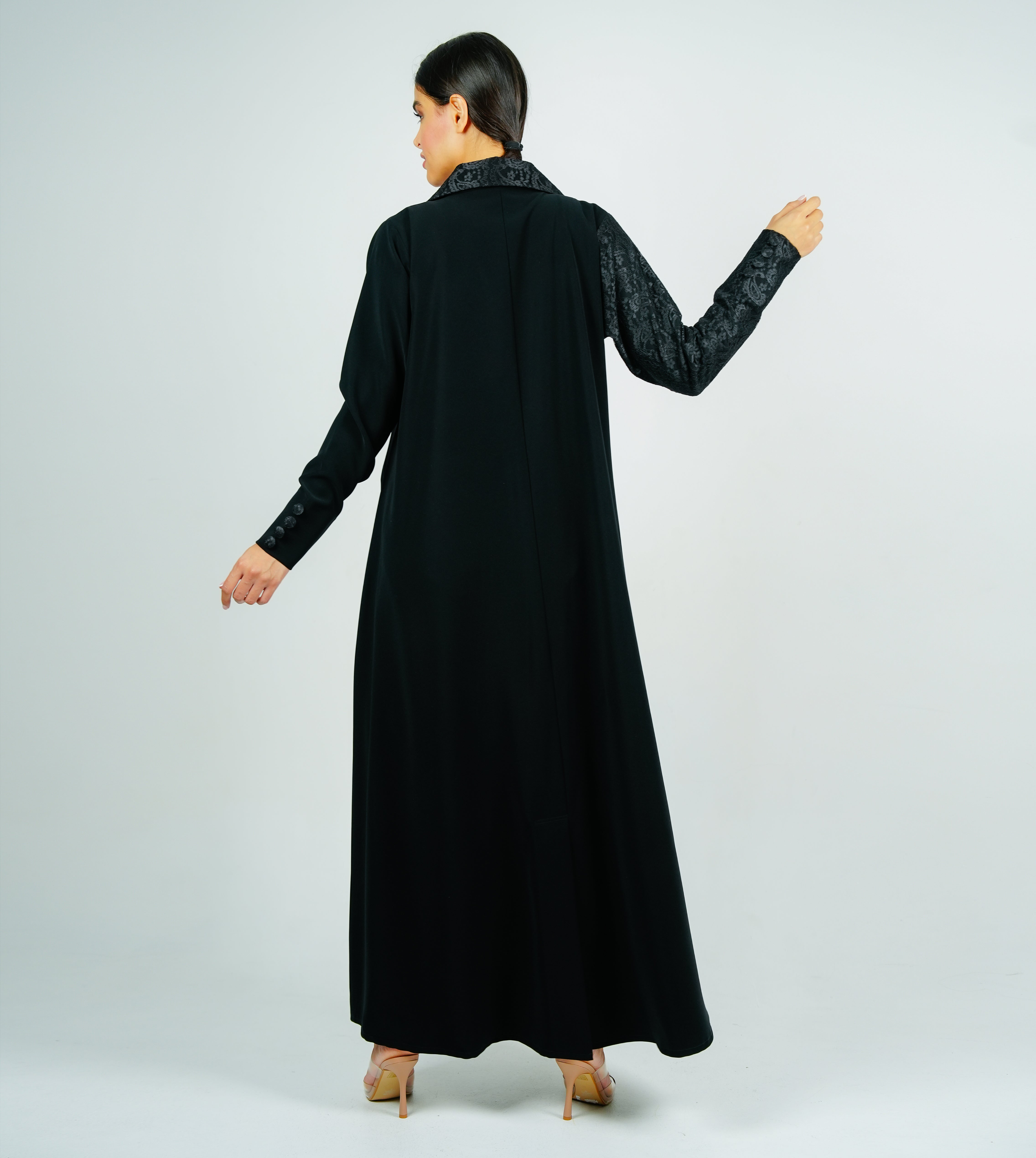 A luxurious blazer abaya with a beautiful half-Dantil cut, adorned with Dantil  buttons.