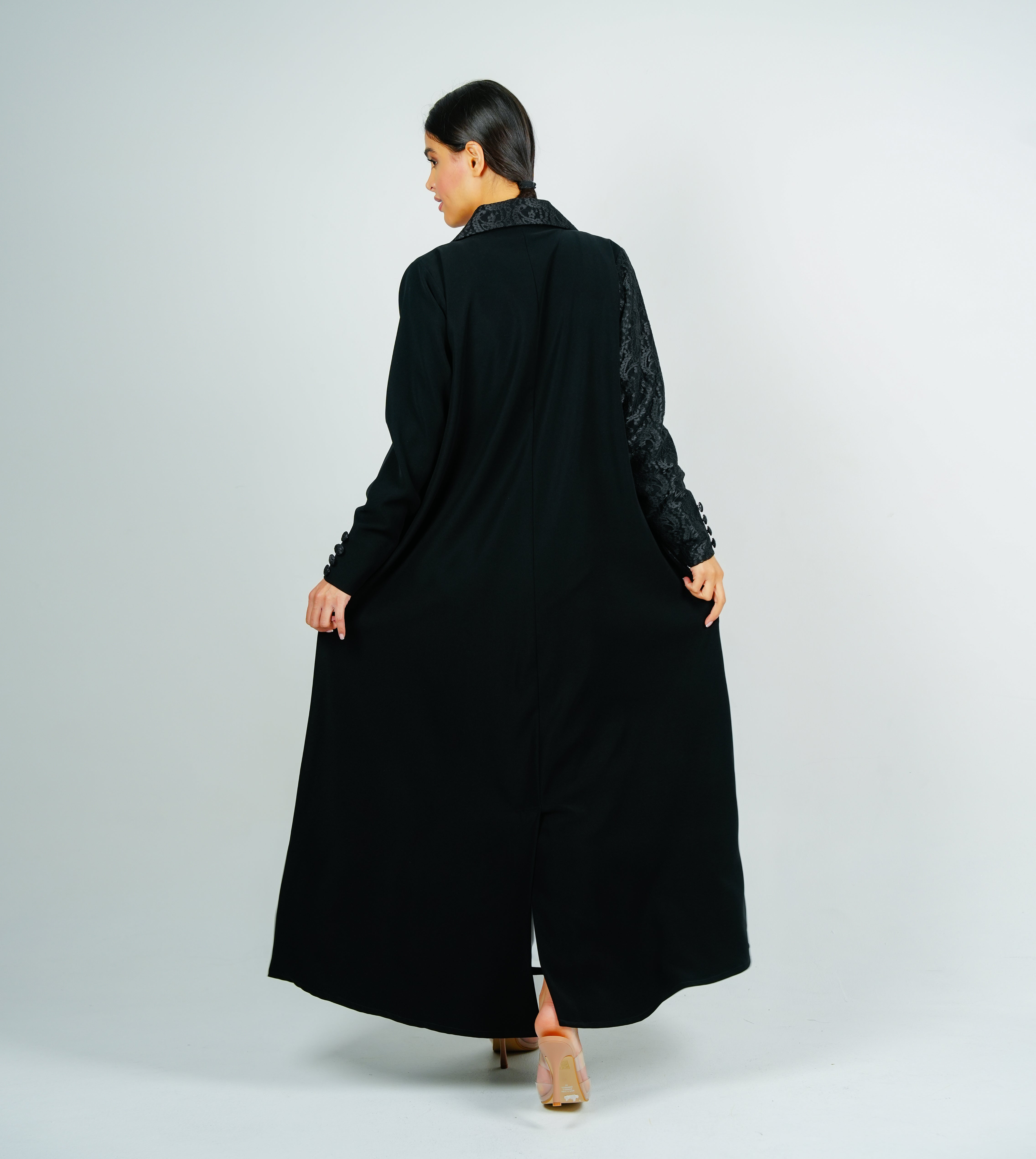 A luxurious blazer abaya with a beautiful half-Dantil cut, adorned with Dantil  buttons. عباية بليزر فاخرة بقصة نصف دانتيل جميل مزينة بأزرار دانتيل