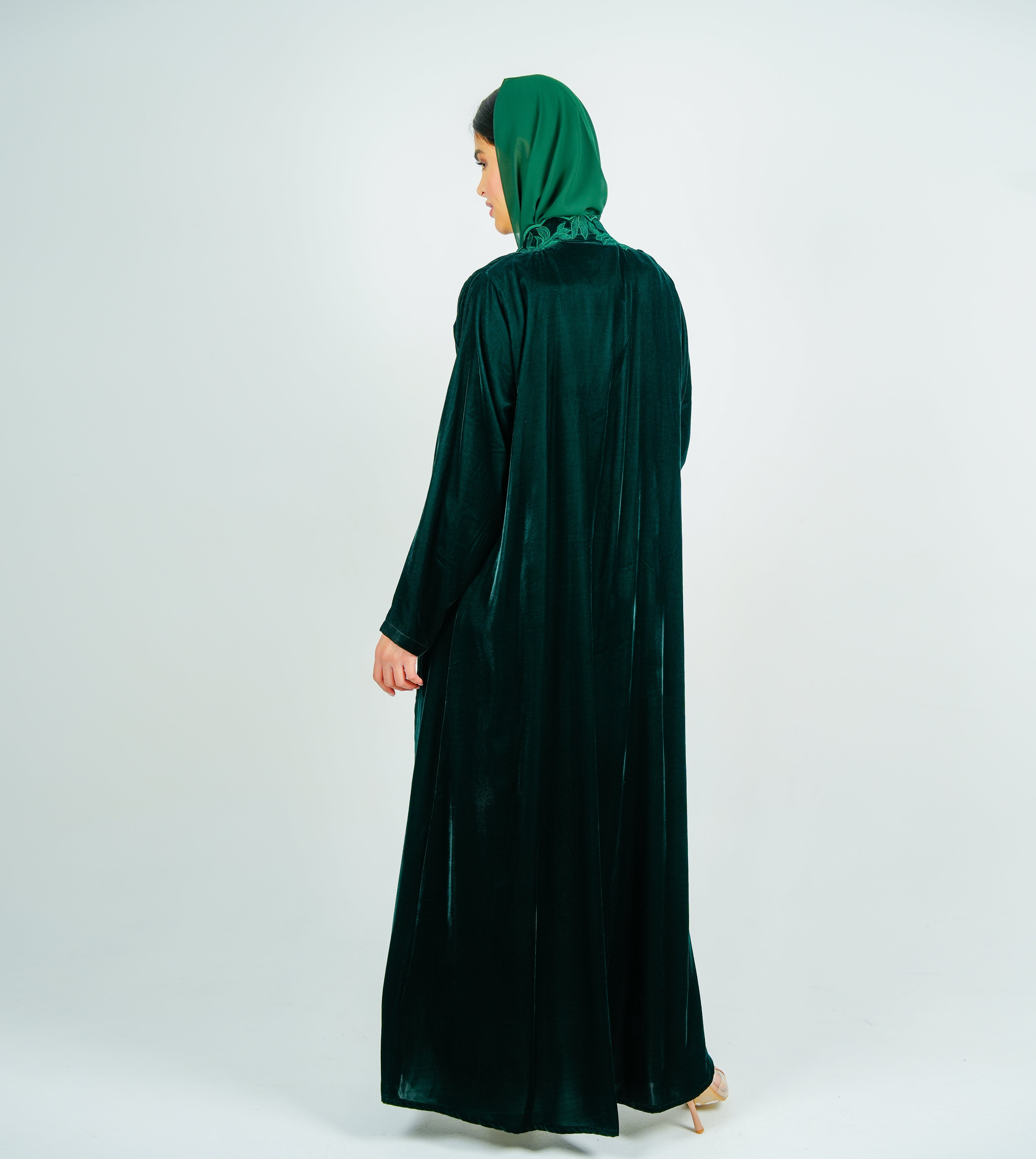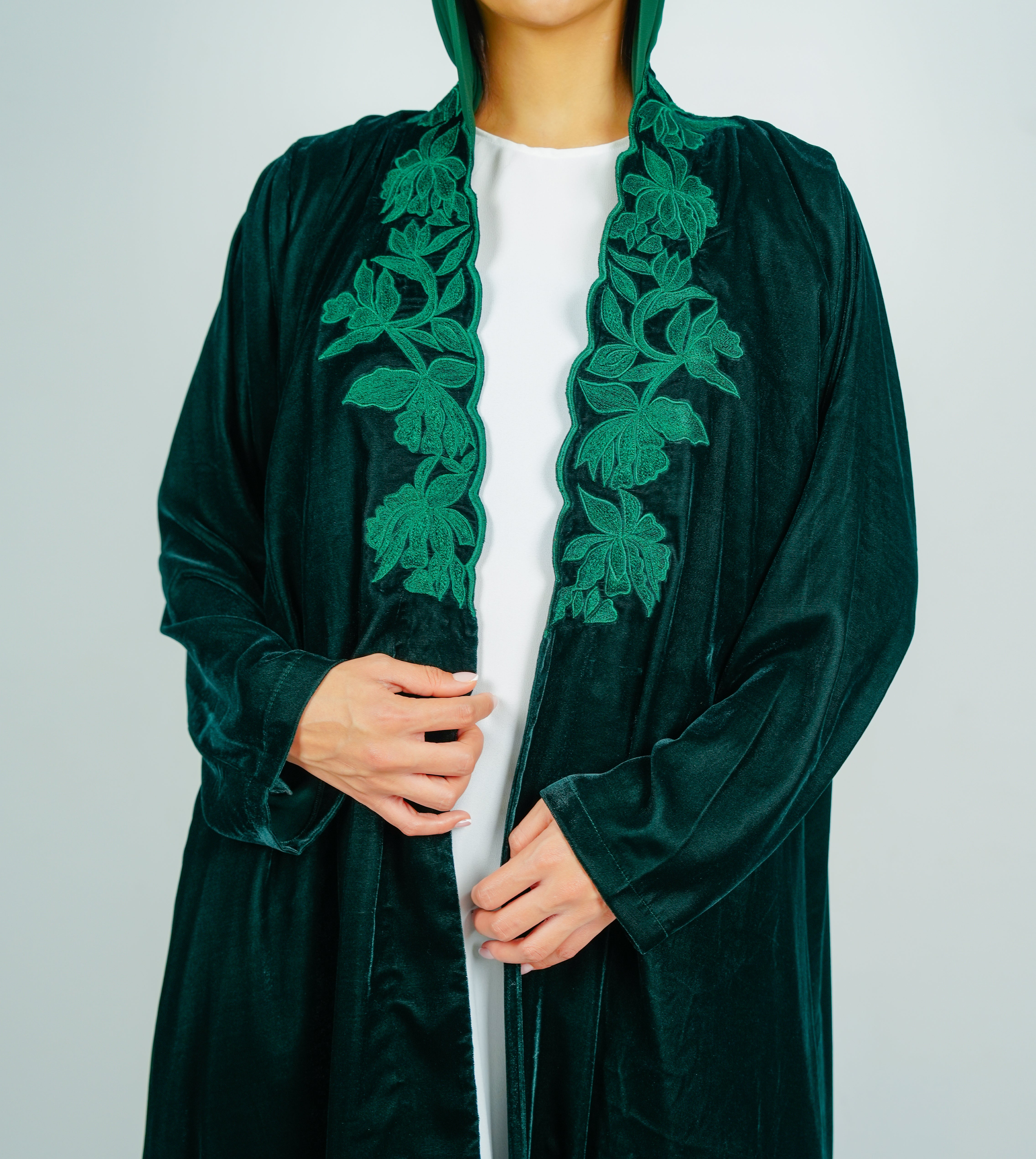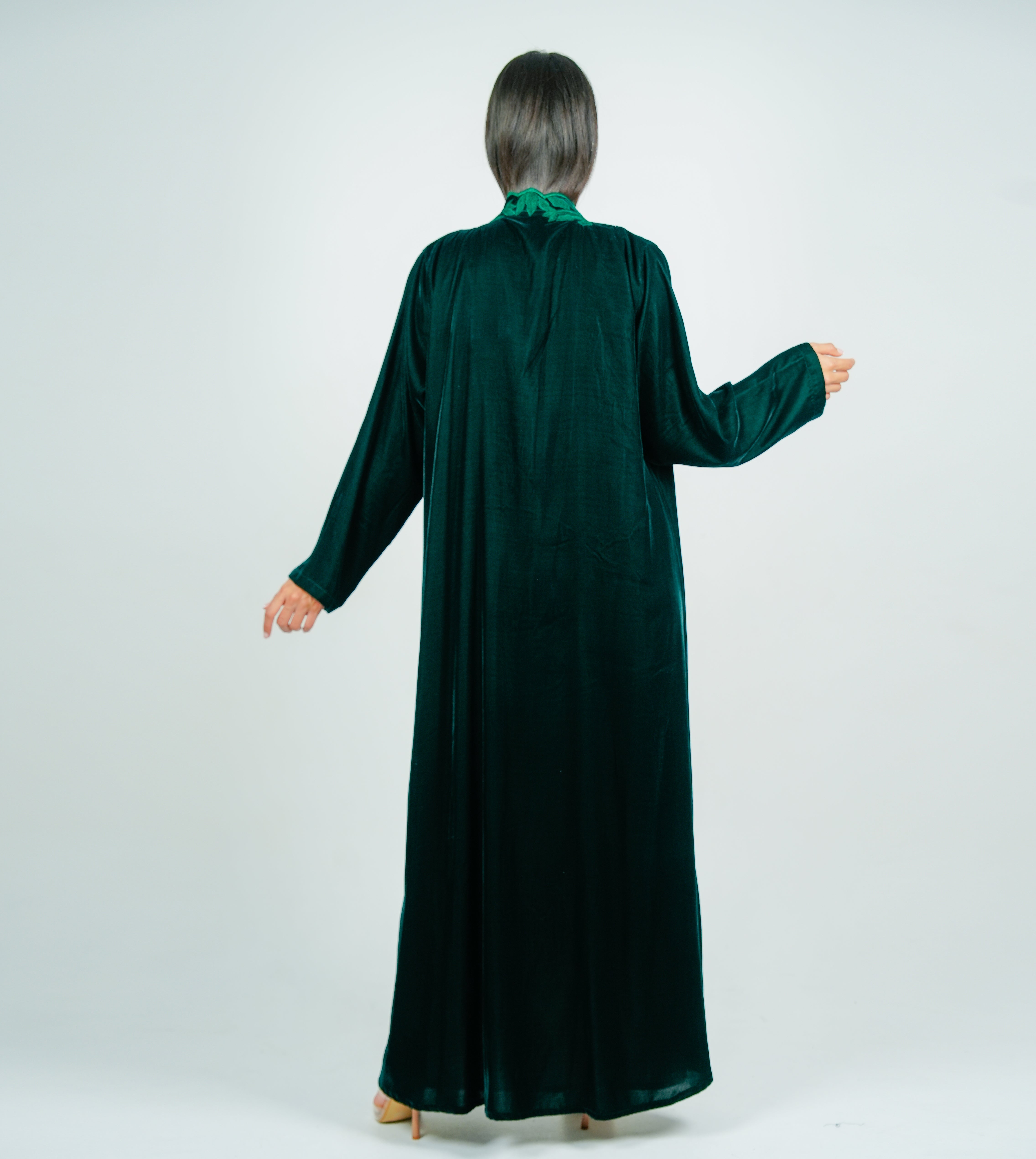 Luxurious velvet Green abaya with  embroidery on the neckline عباية مخملية فاخرة بتطريز على الرقبة انسيابي