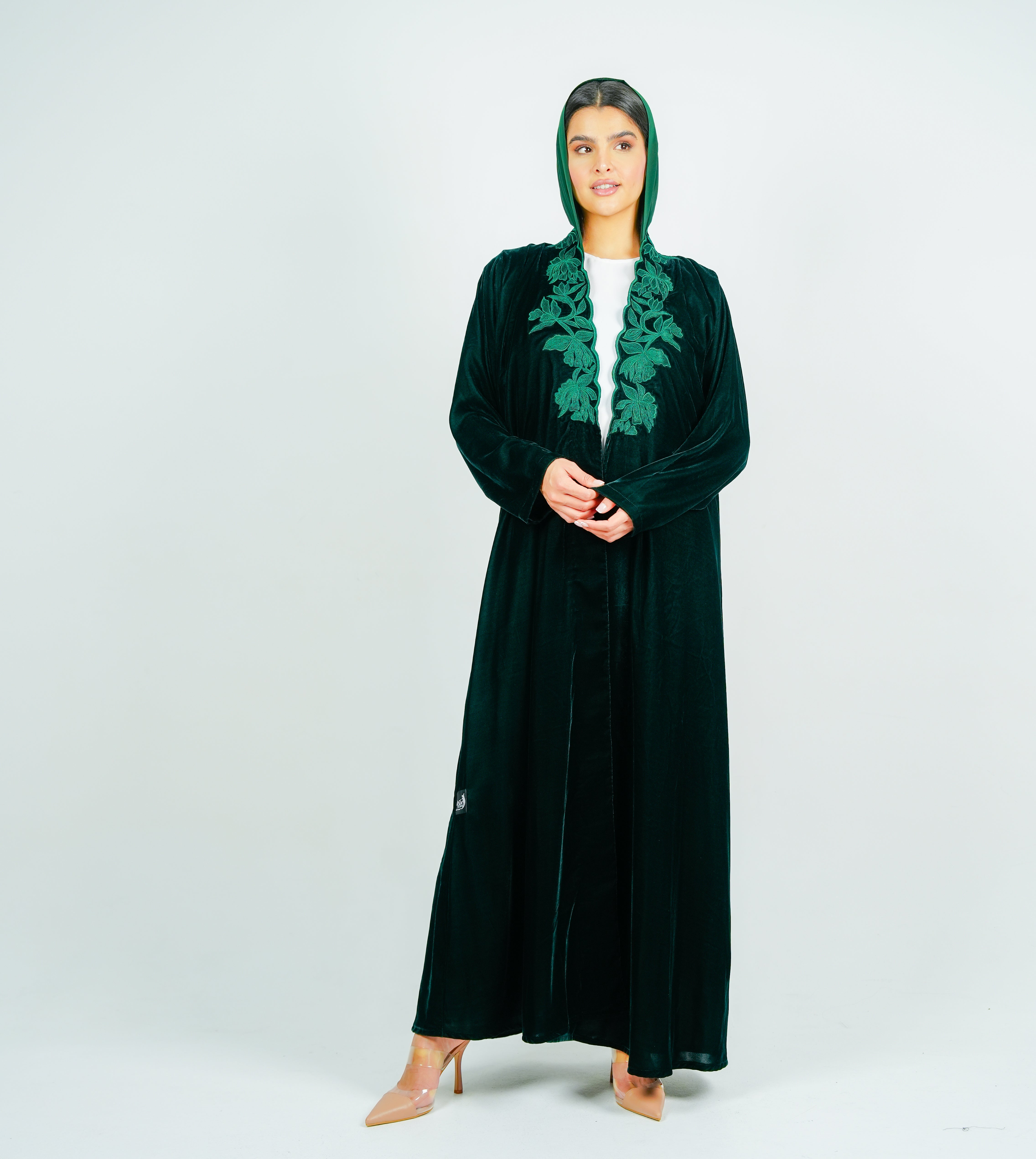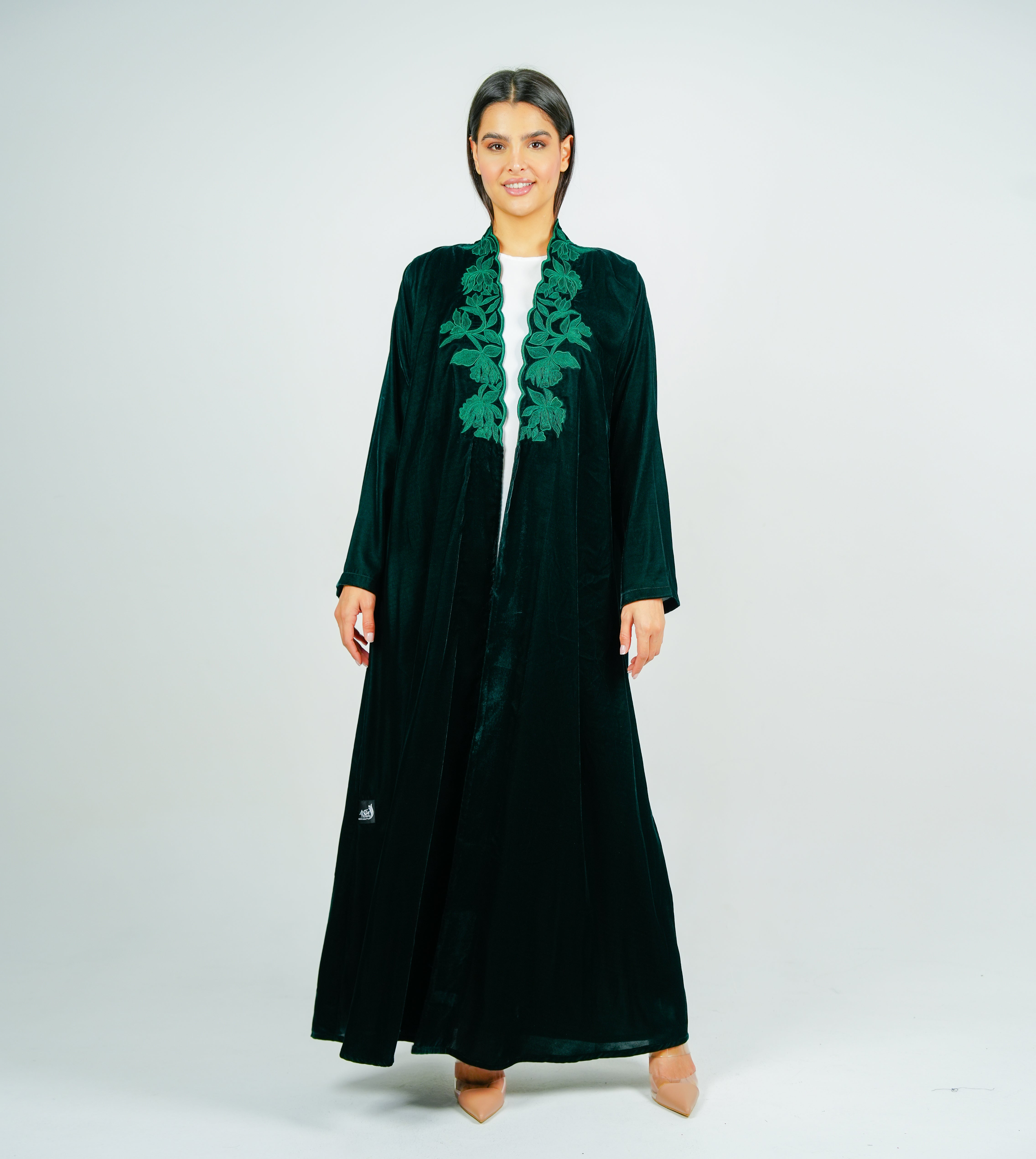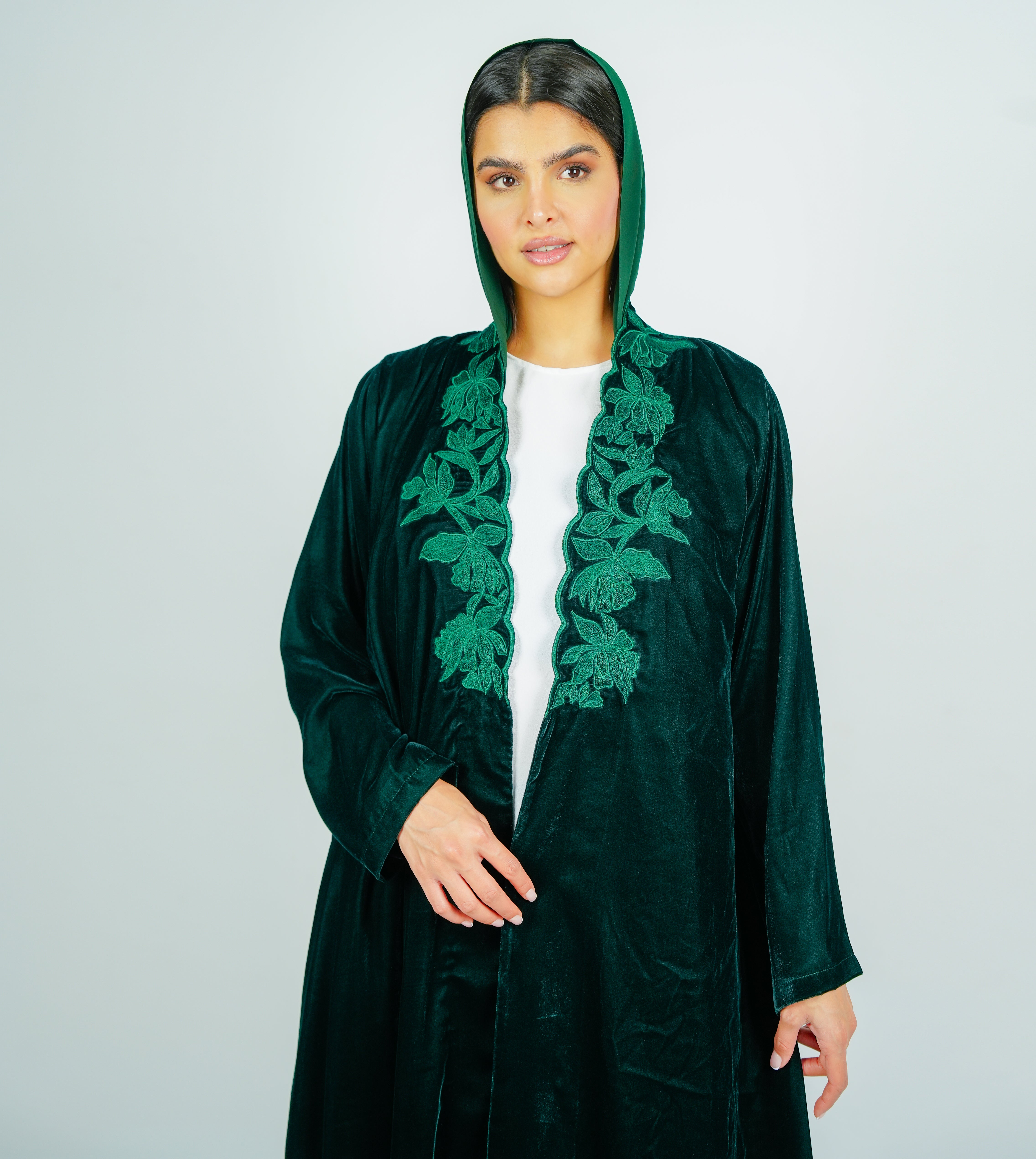 Luxurious velvet Green abaya with  embroidery on the neckline عباية مخملية فاخرة بتطريز على الرقبة انسيابي