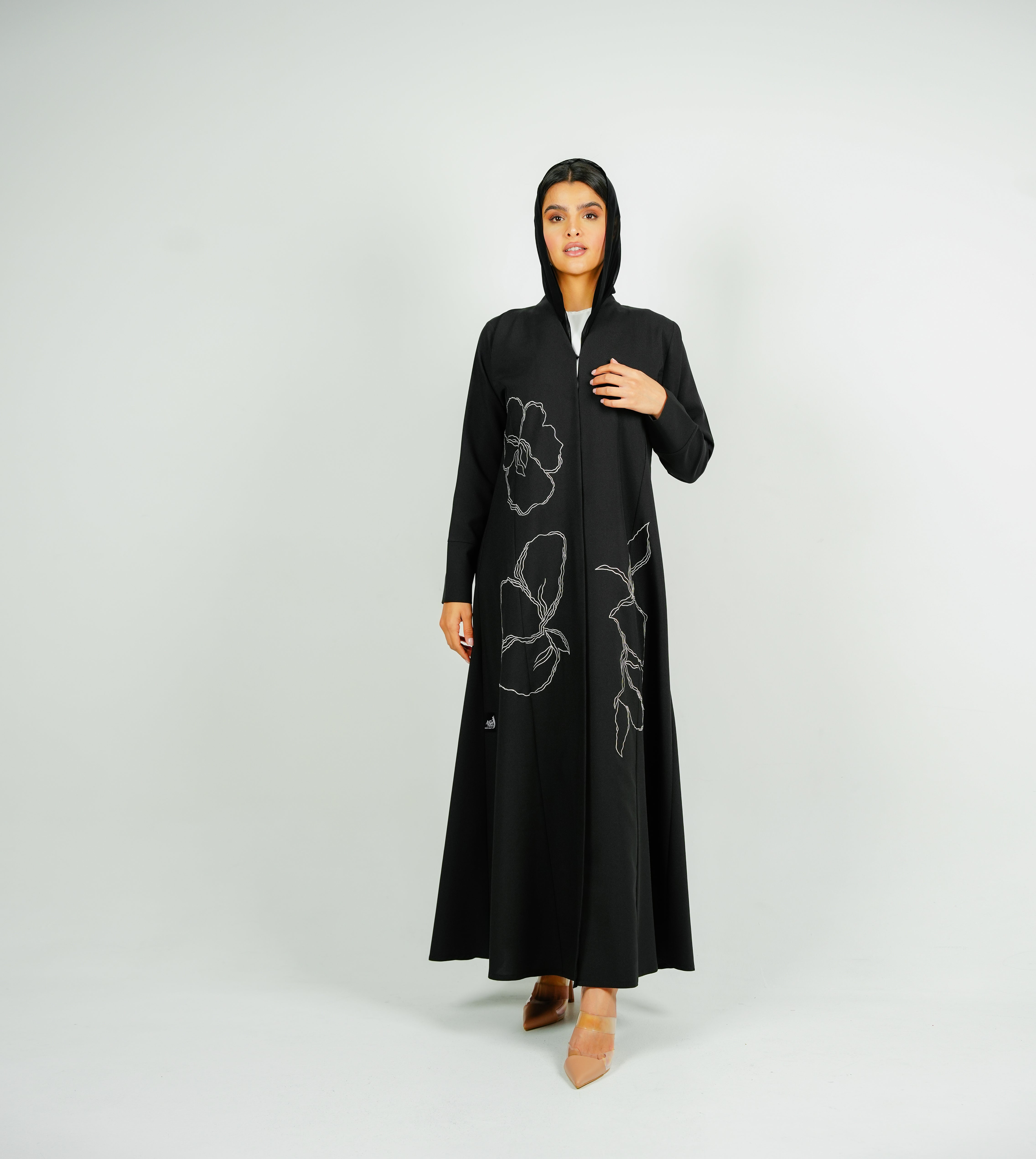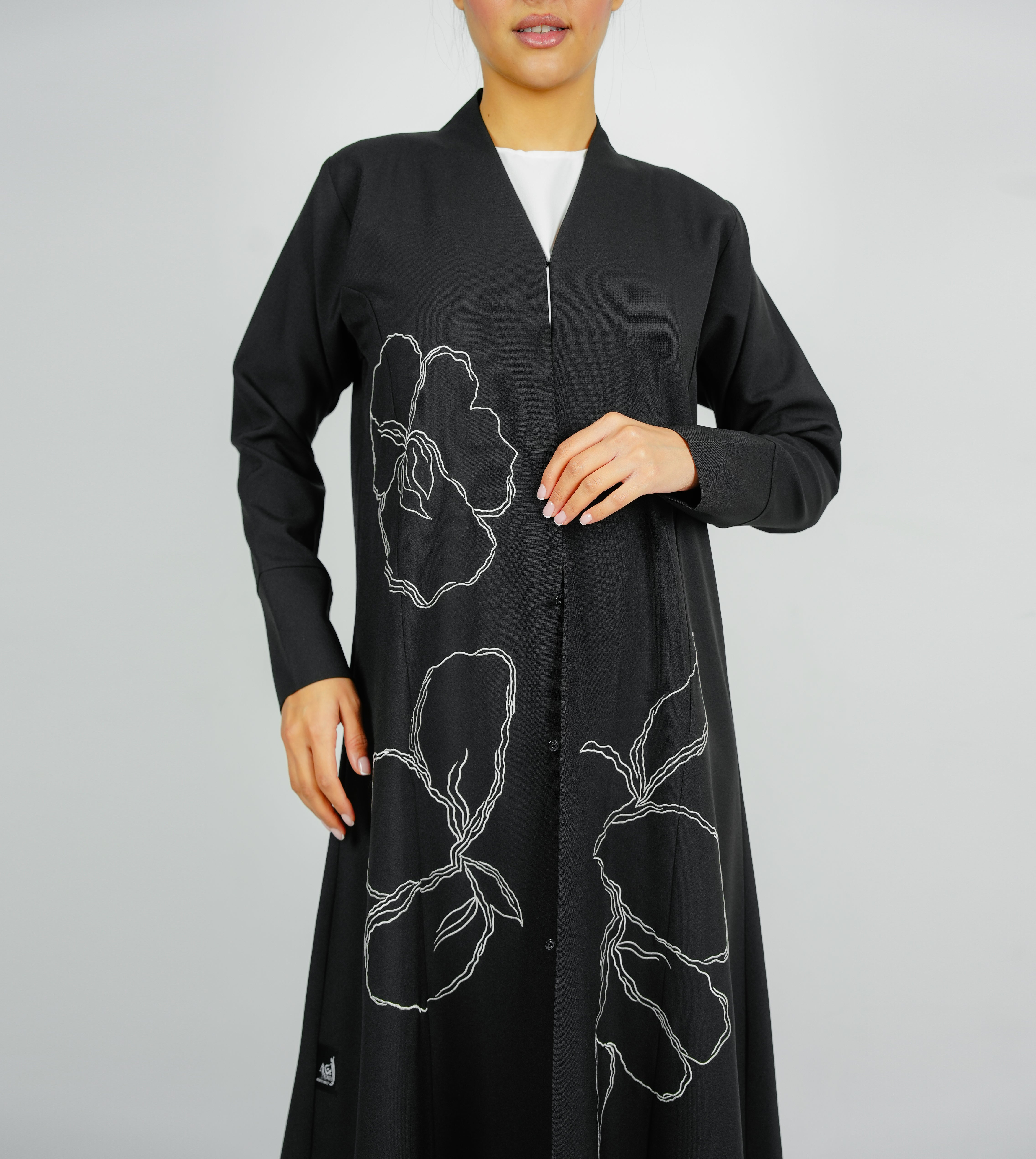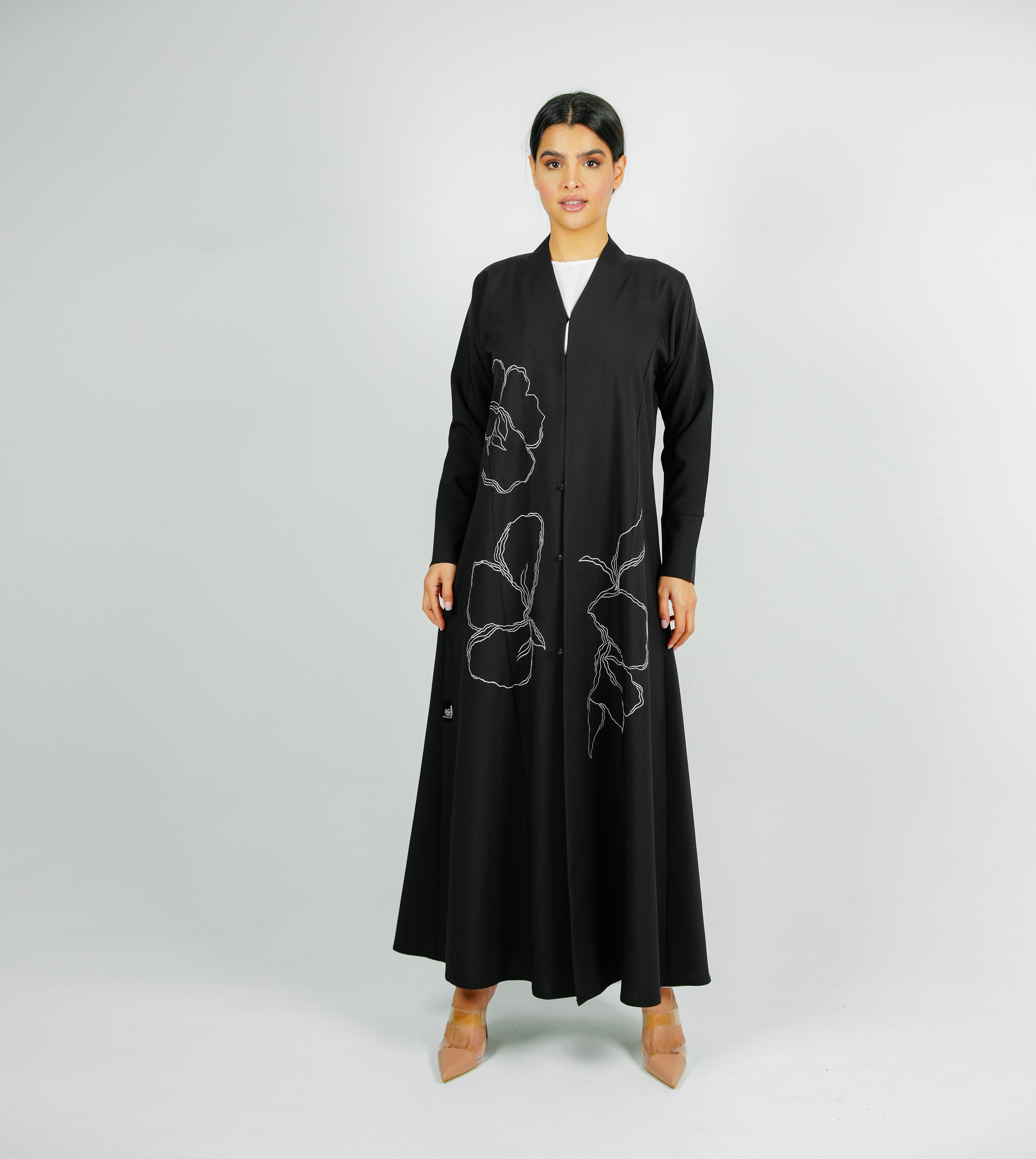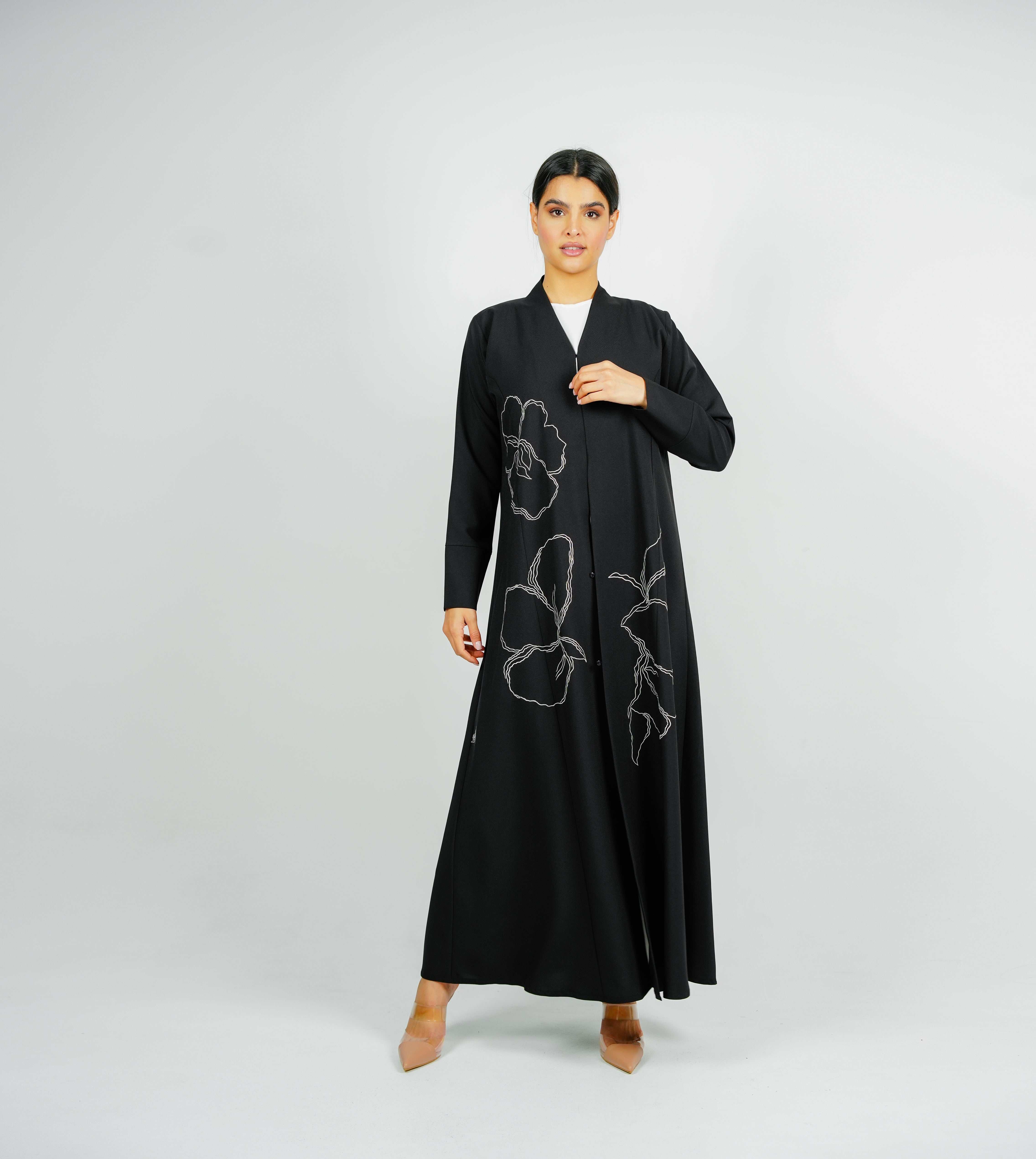 Embellishment Abaya with Embroidered Flower Design عباية مزينة بتصميم زهور مطرزة