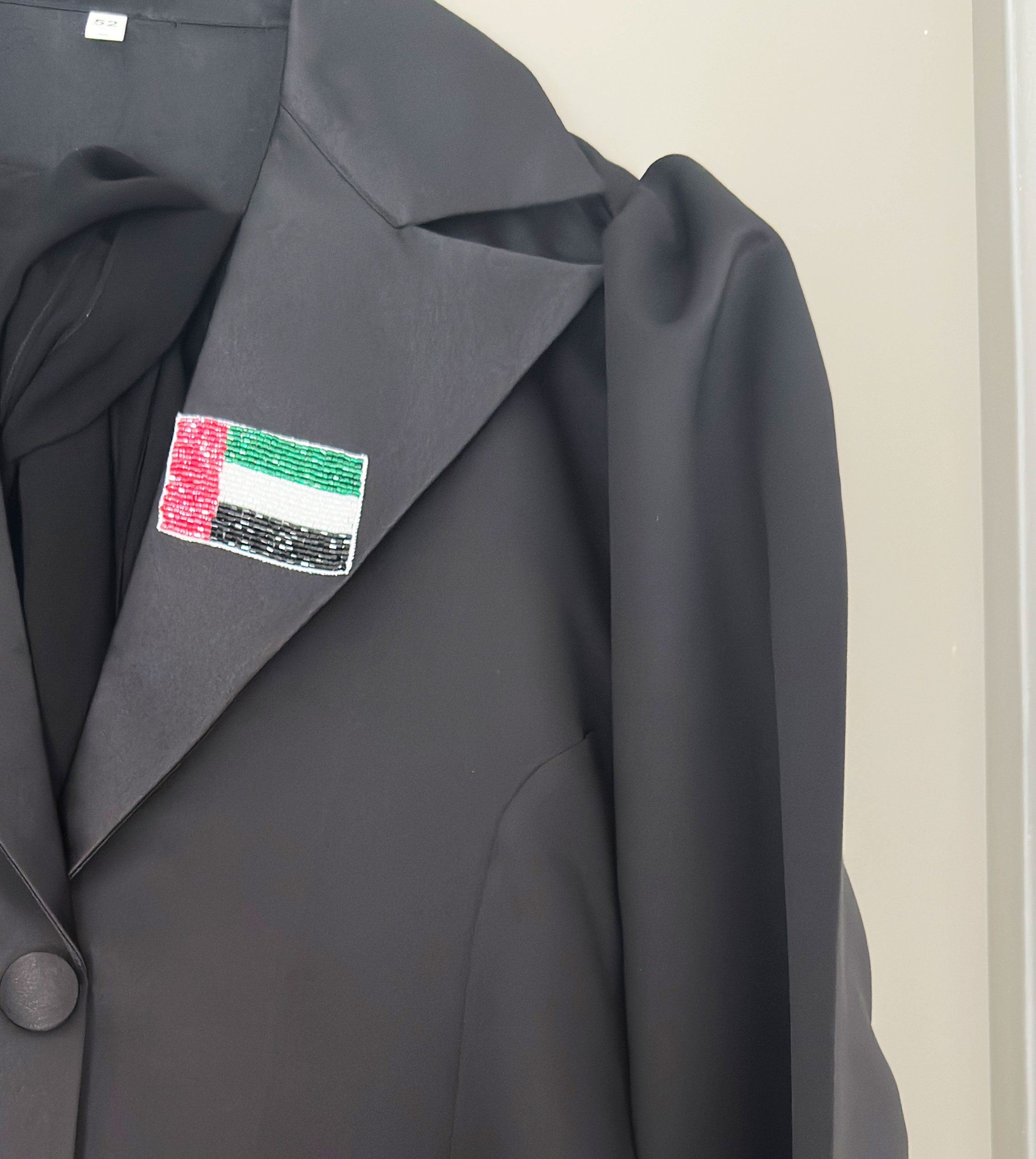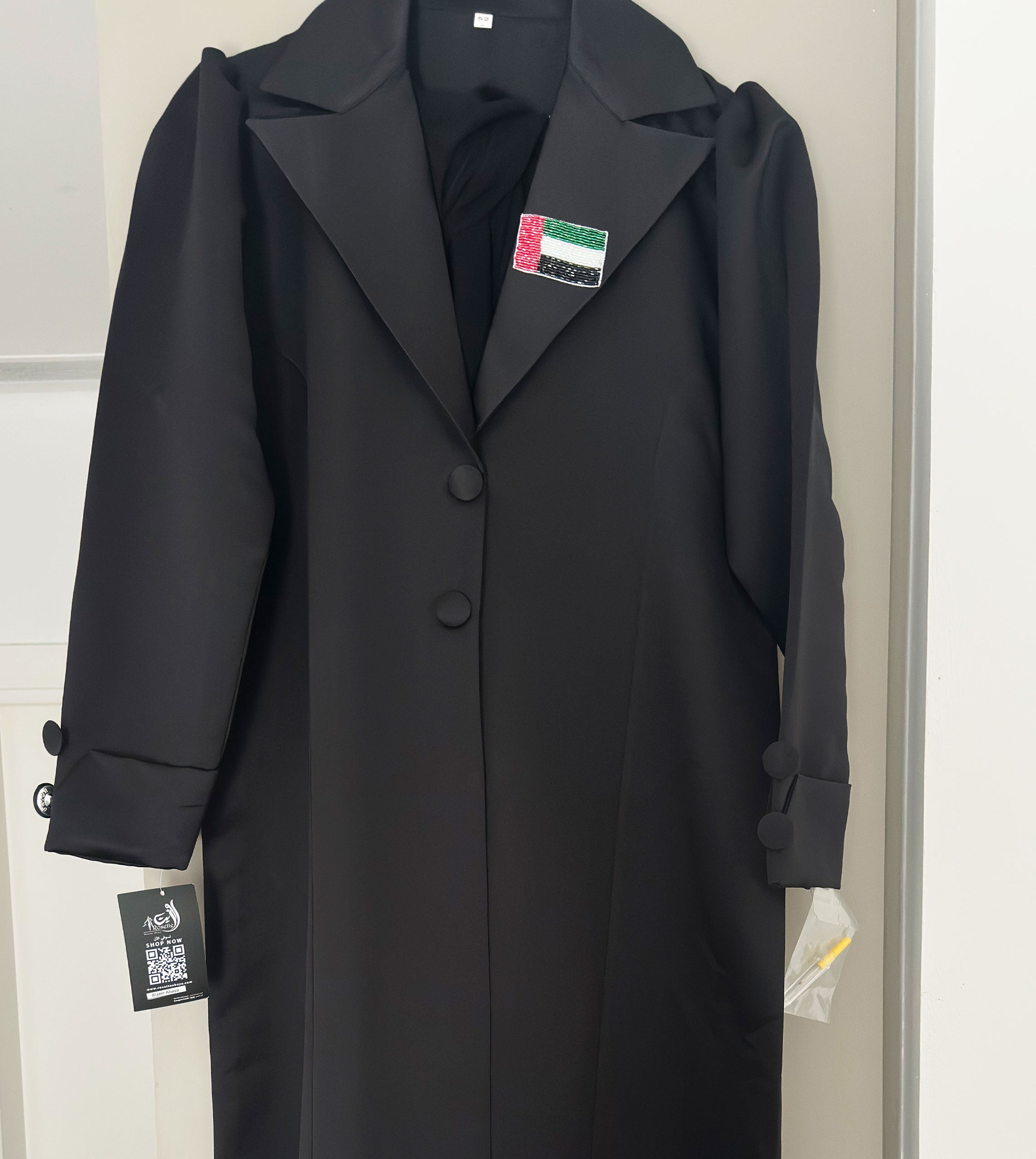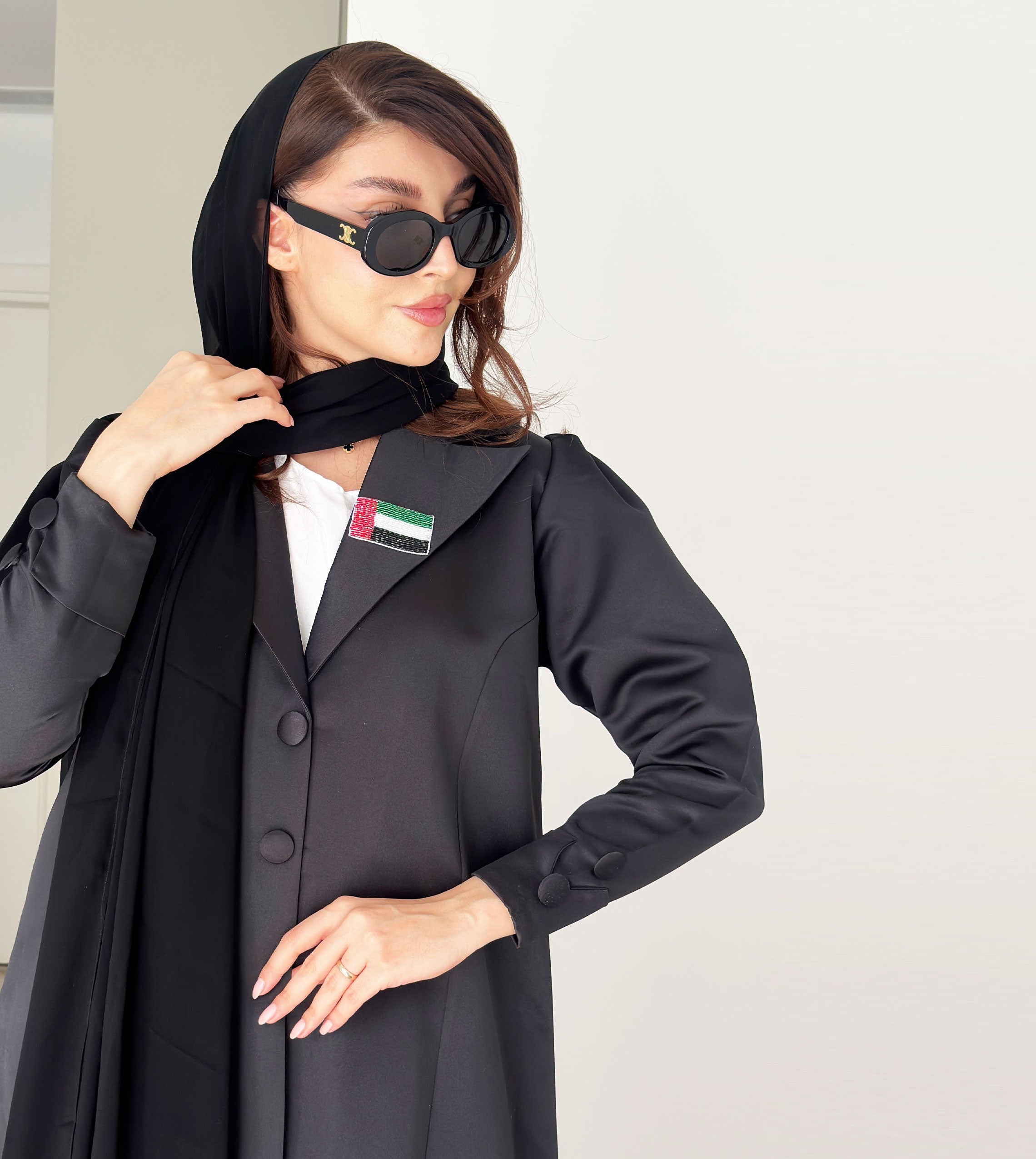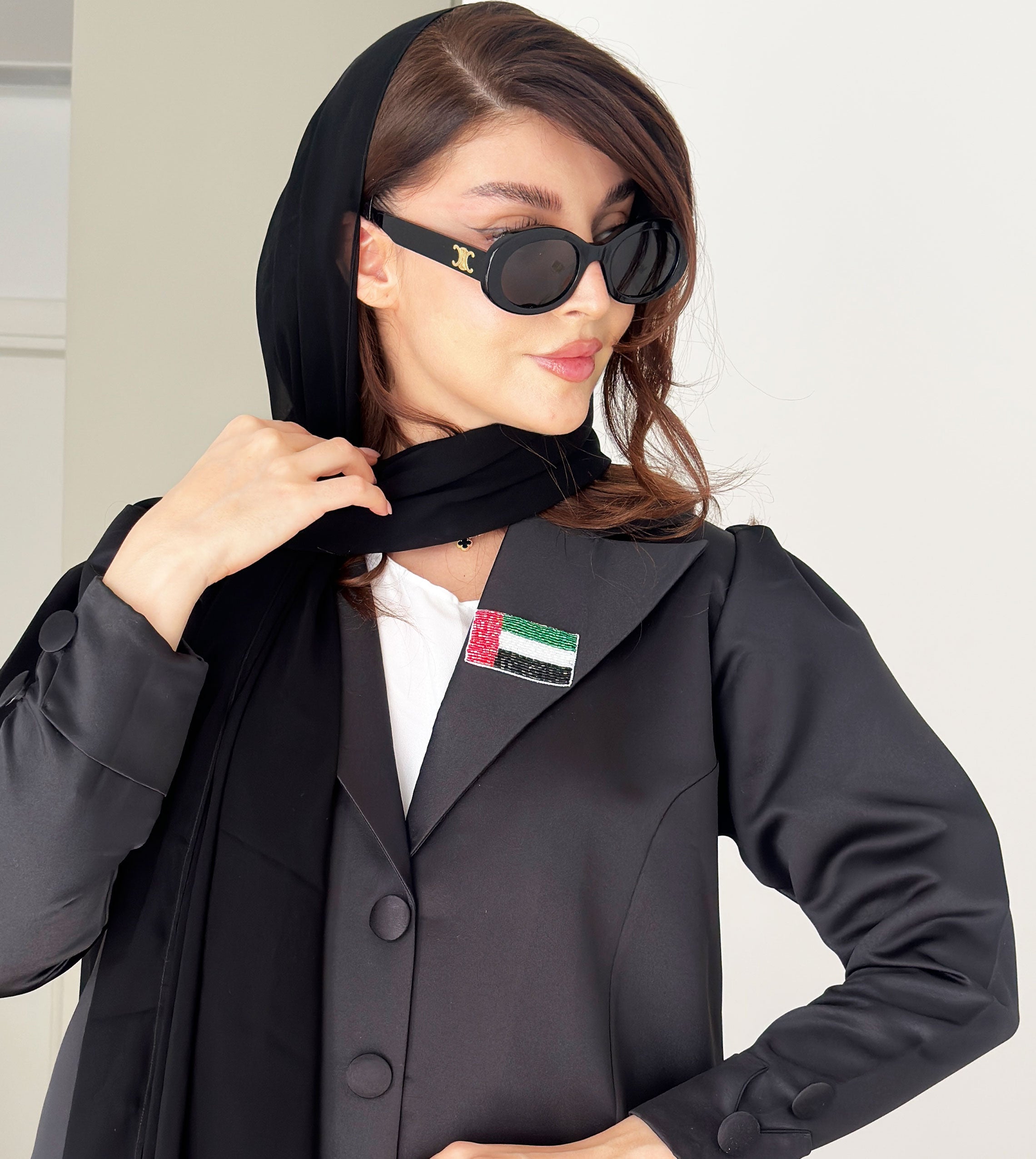 احتفلي بفخر الإمارات بأسلوب رقيق مع بليزر عباية أنيقة بتطريز يدوي للعلم على الياقة و ابرة تستطيعين التحكم به + شيللا مطرزة بالوان العلم - المصممة للمرأة الإماراتية العصرية Celebrate the pride of the UAE elegant blazer-style featuring hand-embroidered flag on the collar +shilla embroidered flag's colors – Modern Emirati...