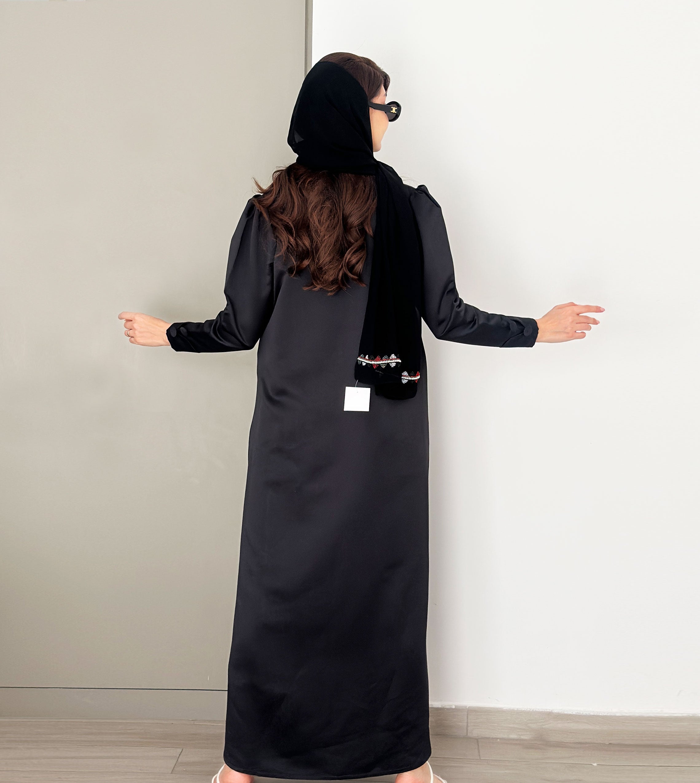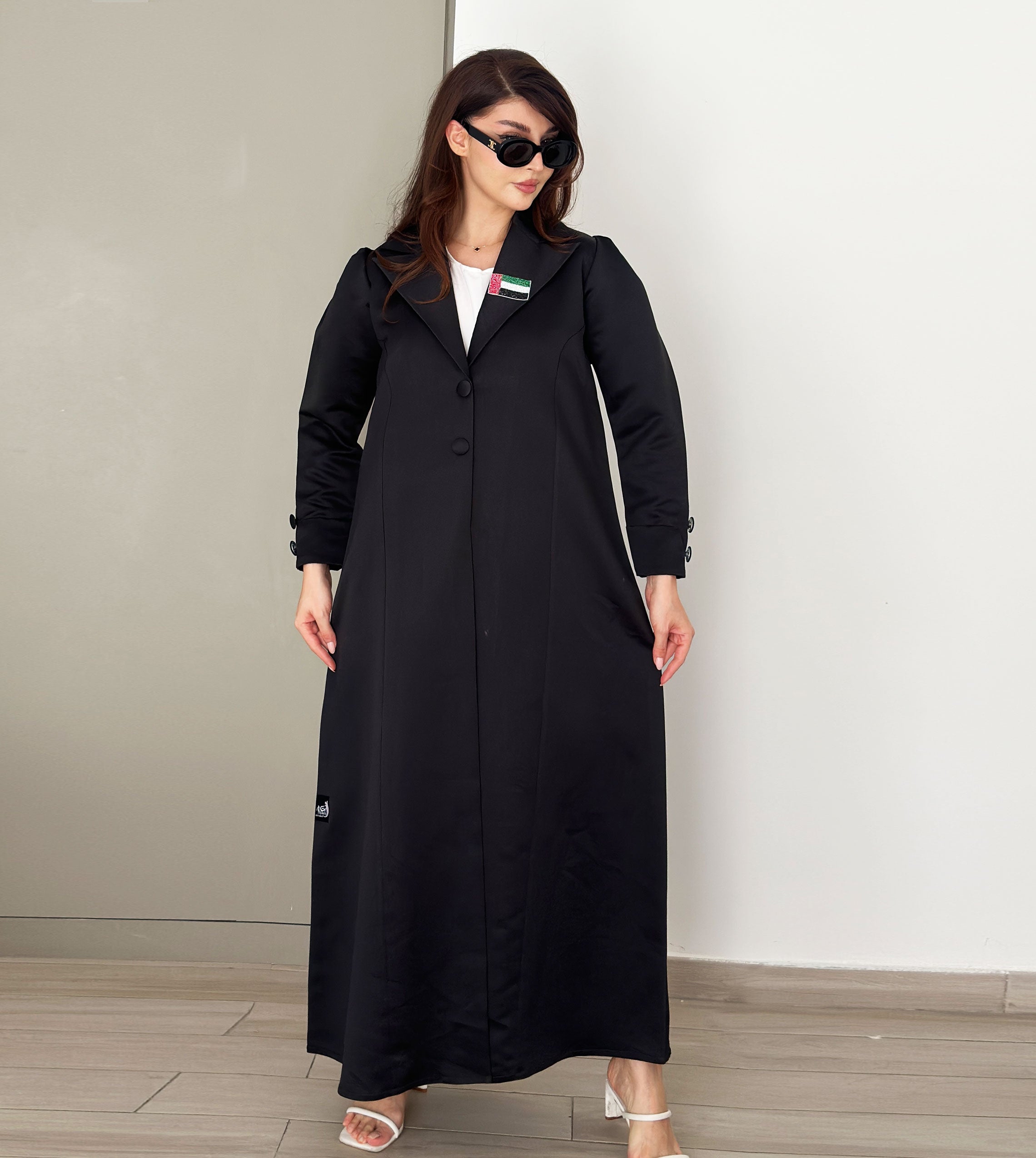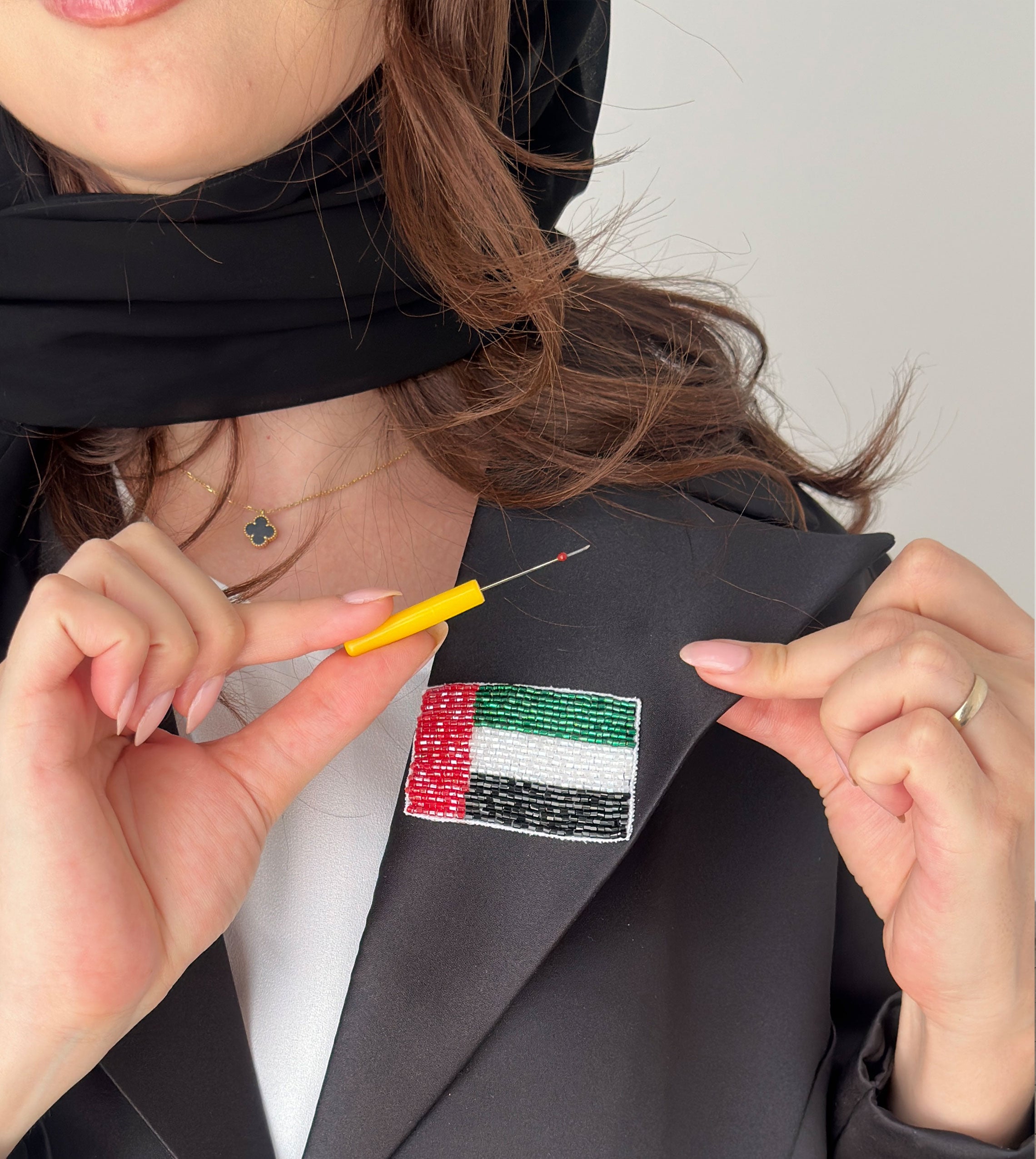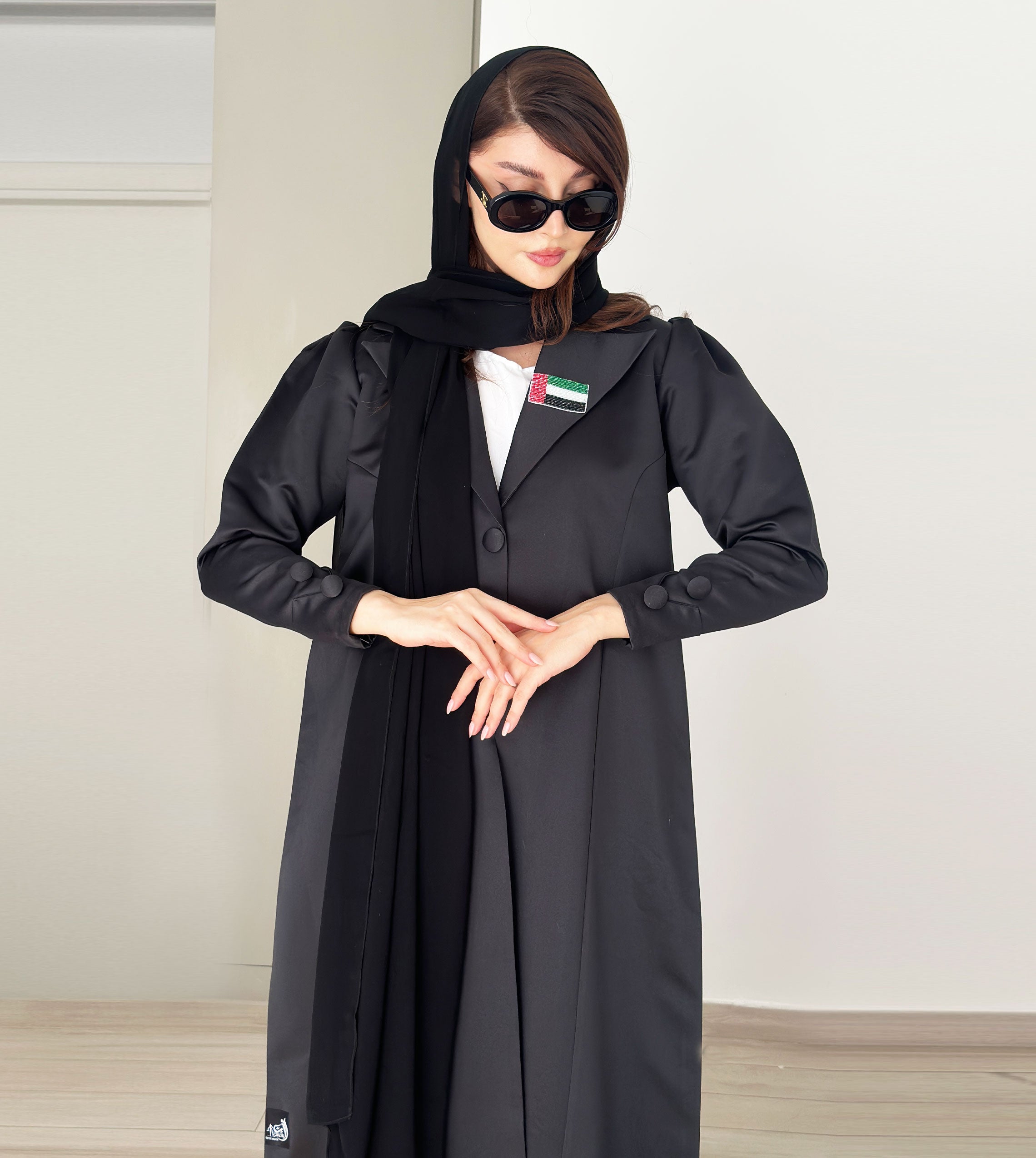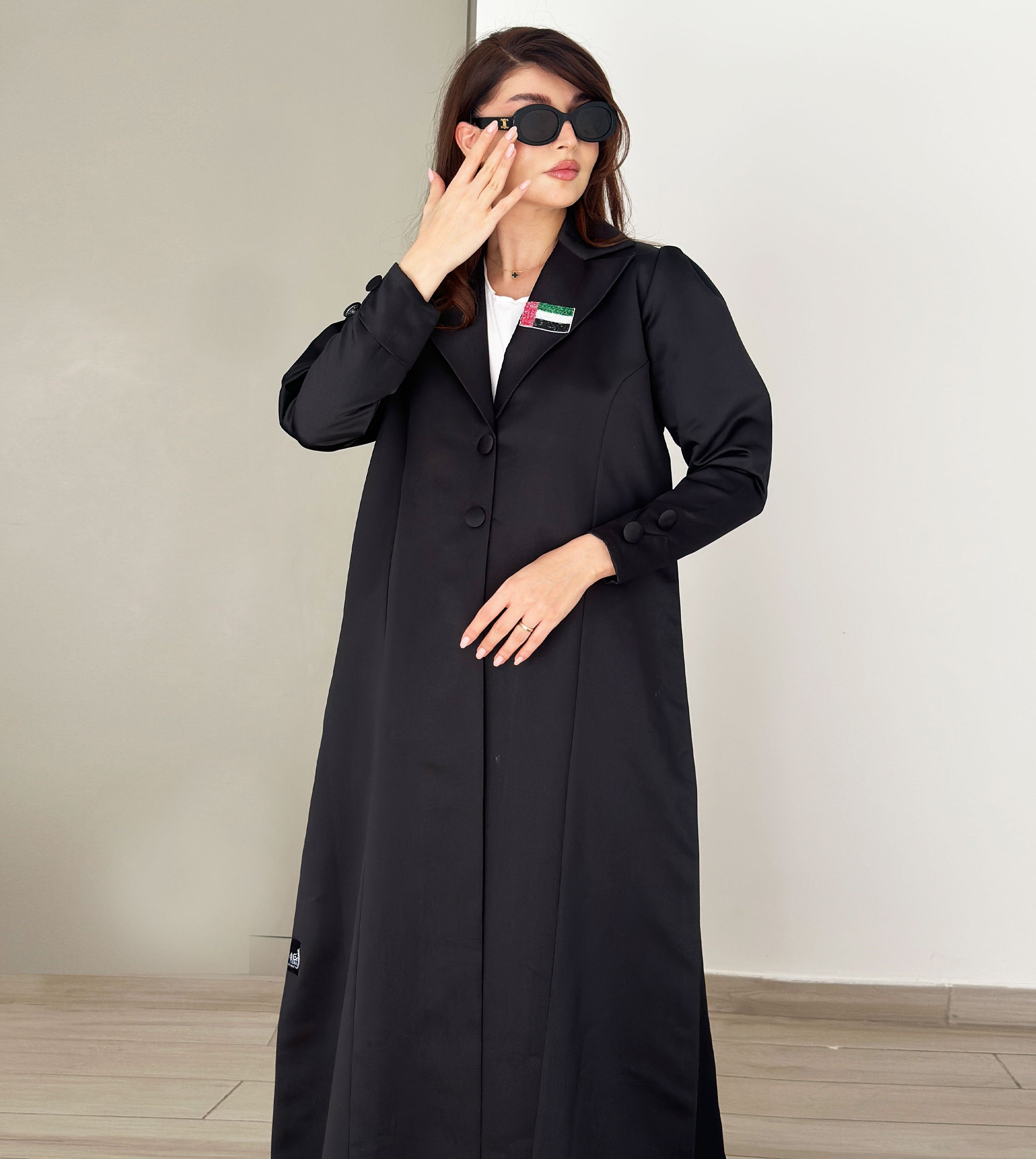 احتفلي بفخر الإمارات بأسلوب رقيق مع بليزر عباية أنيقة بتطريز يدوي للعلم على الياقة و ابرة تستطيعين التحكم به + شيللا مطرزة بالوان العلم - المصممة للمرأة الإماراتية العصرية Celebrate the pride of the UAE elegant blazer-style featuring hand-embroidered flag on the collar +shilla embroidered flag's colors – Modern Emirati...