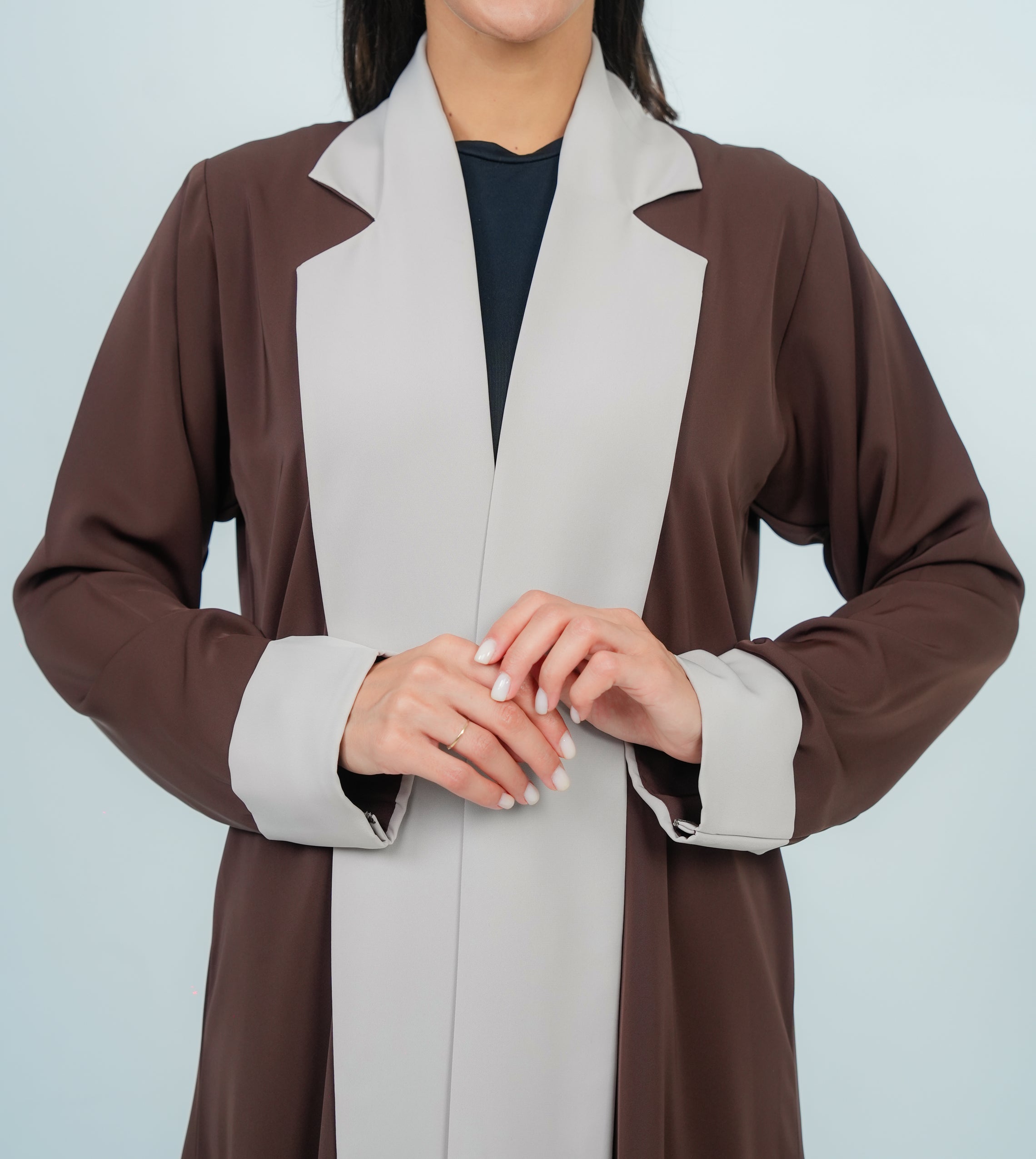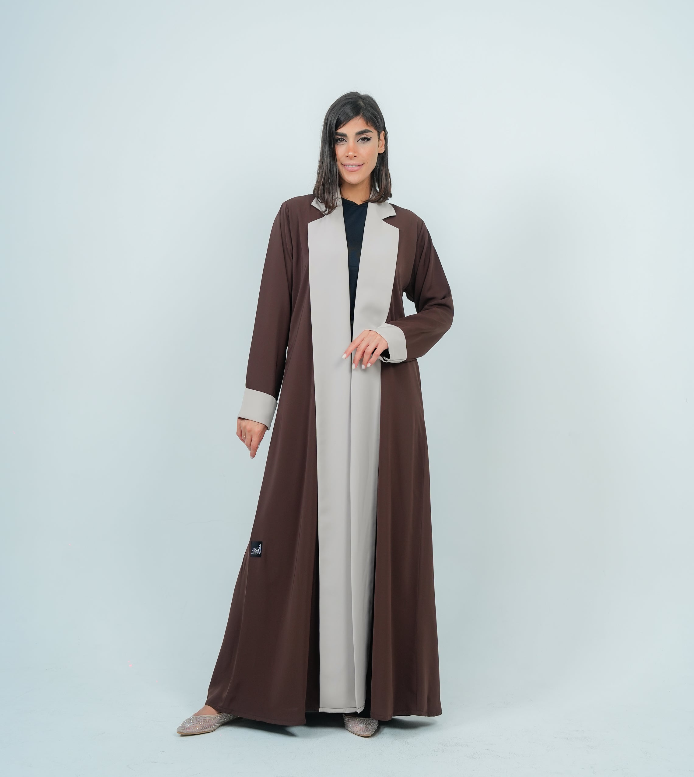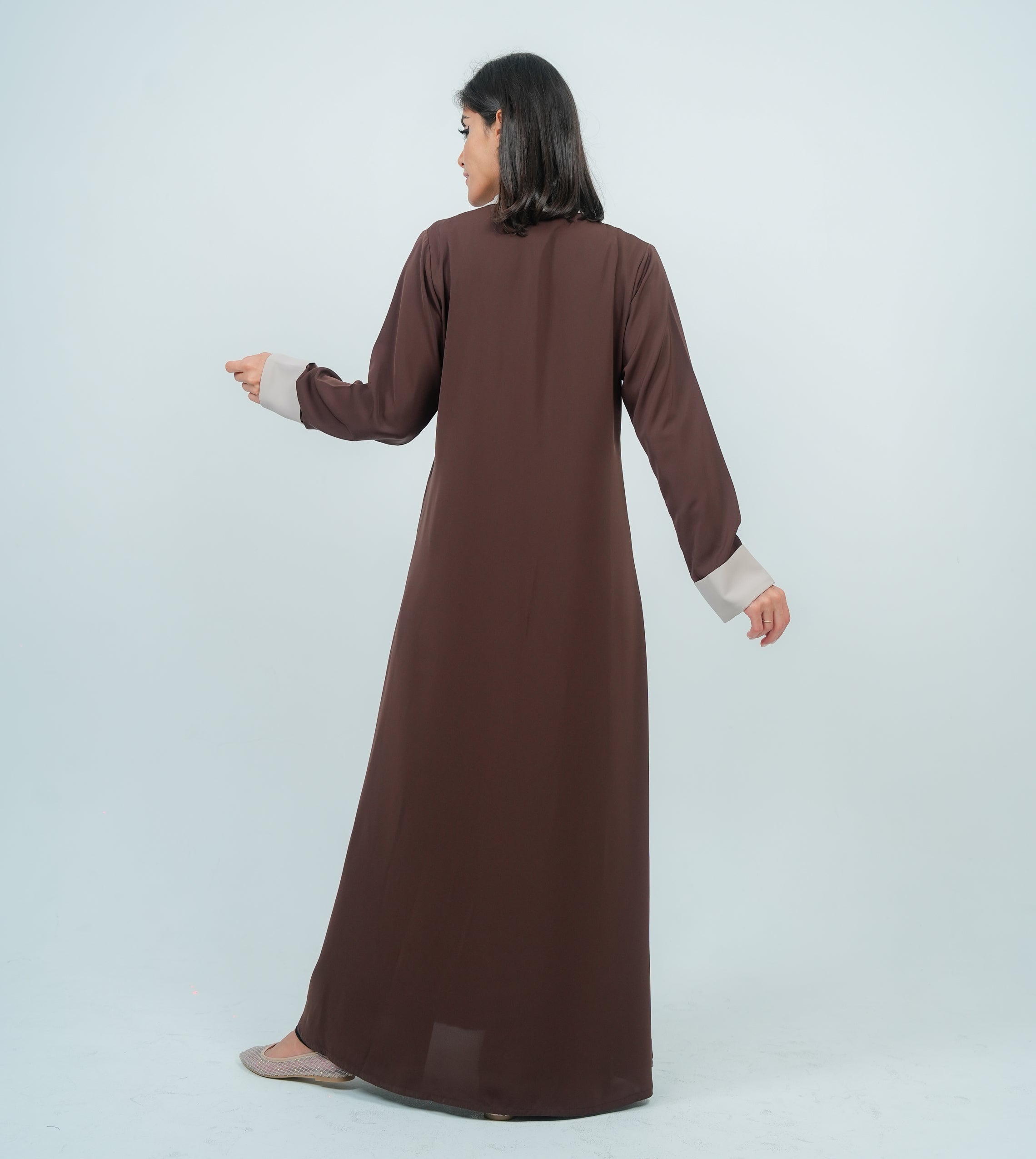 Abaya embodies effortless sophistication with its warm brown hue and refined beige design detailing عباية تُجسّد أناقةً راقيةً بلمستها البنيّة الدافئة وتفاصيل تصميمها البيجيّ الأنيق