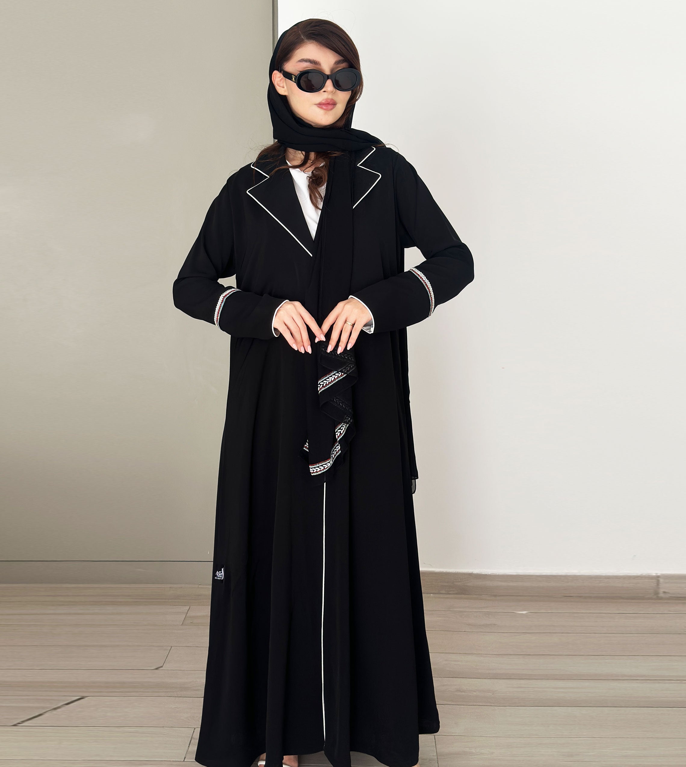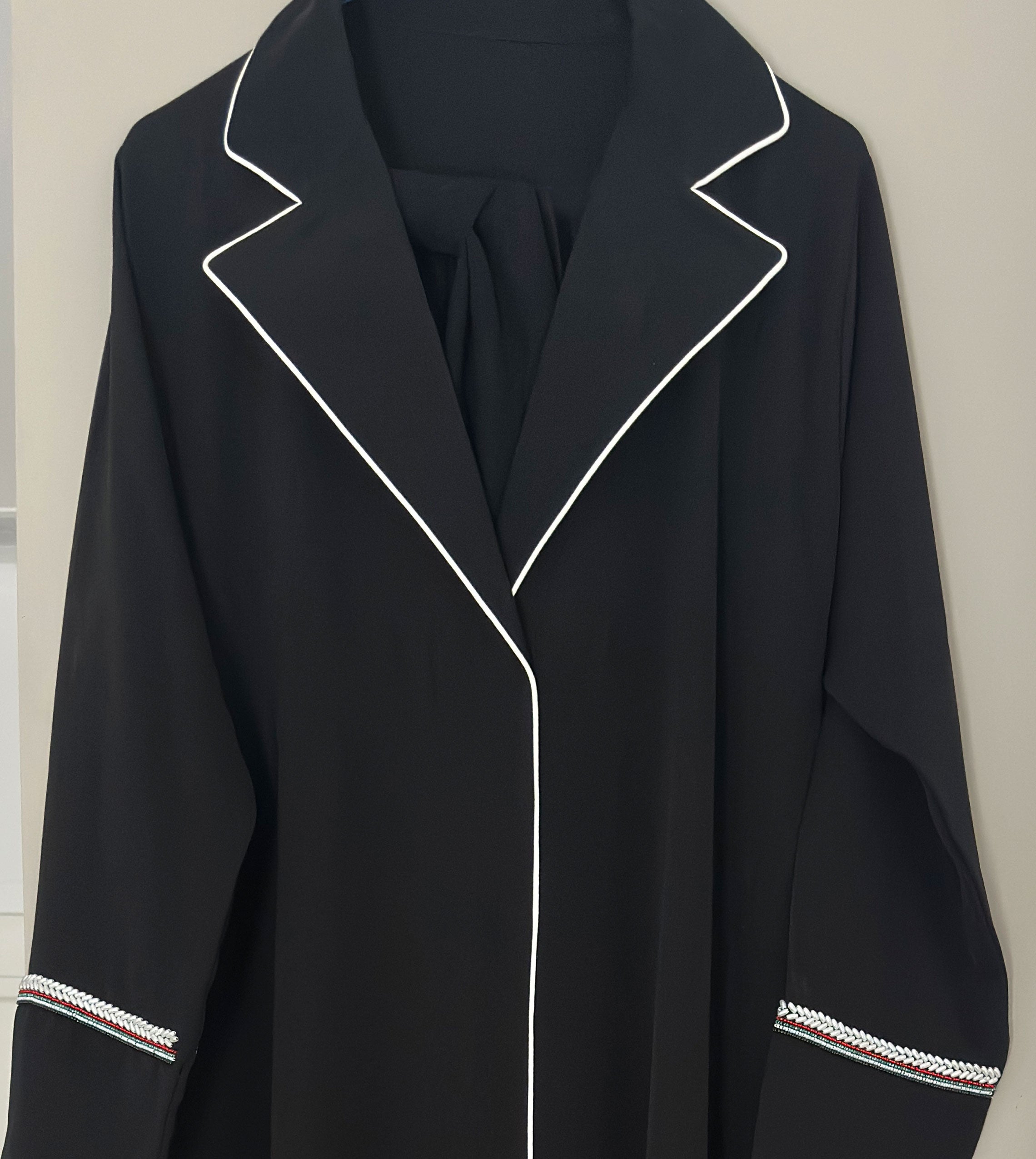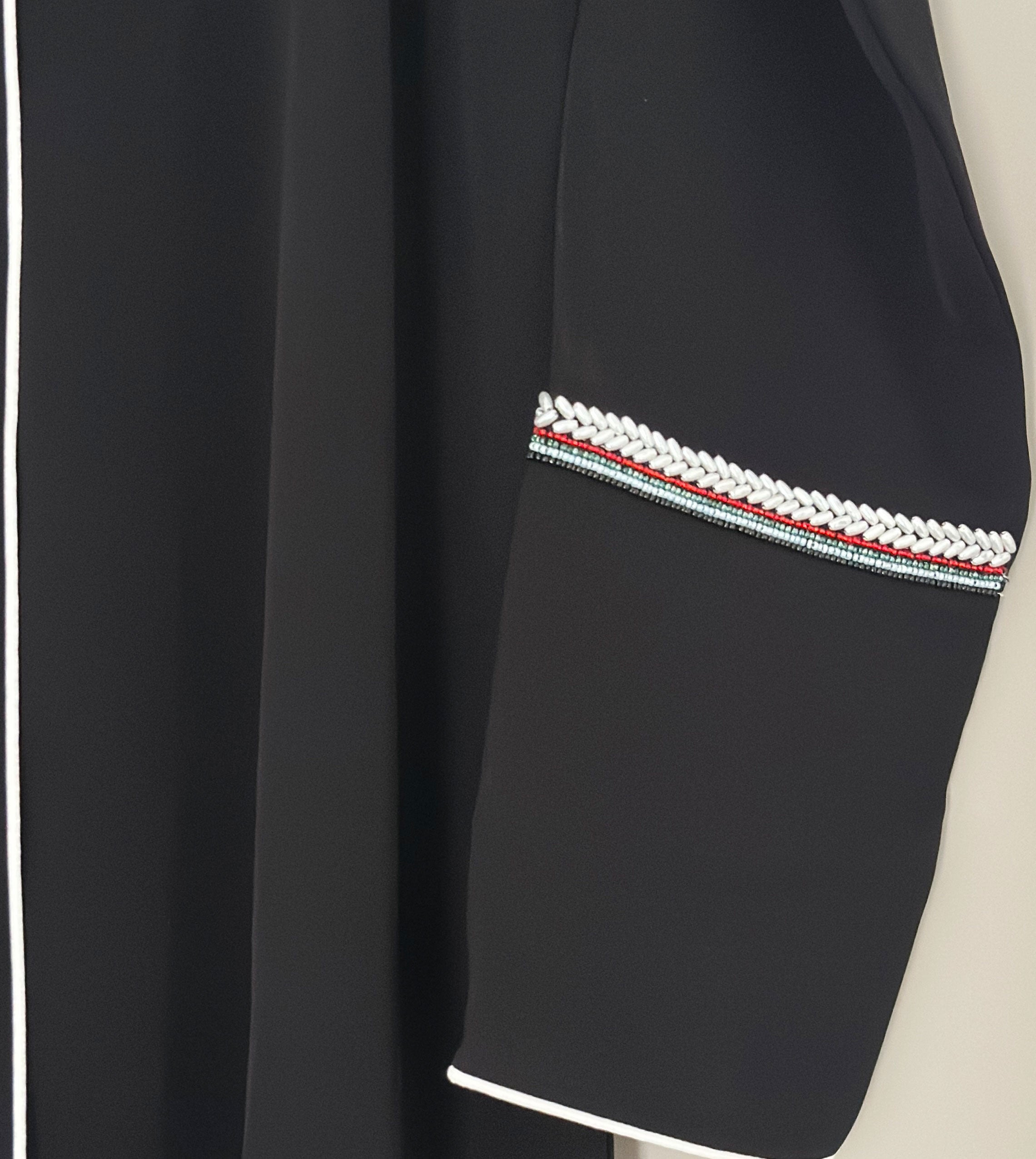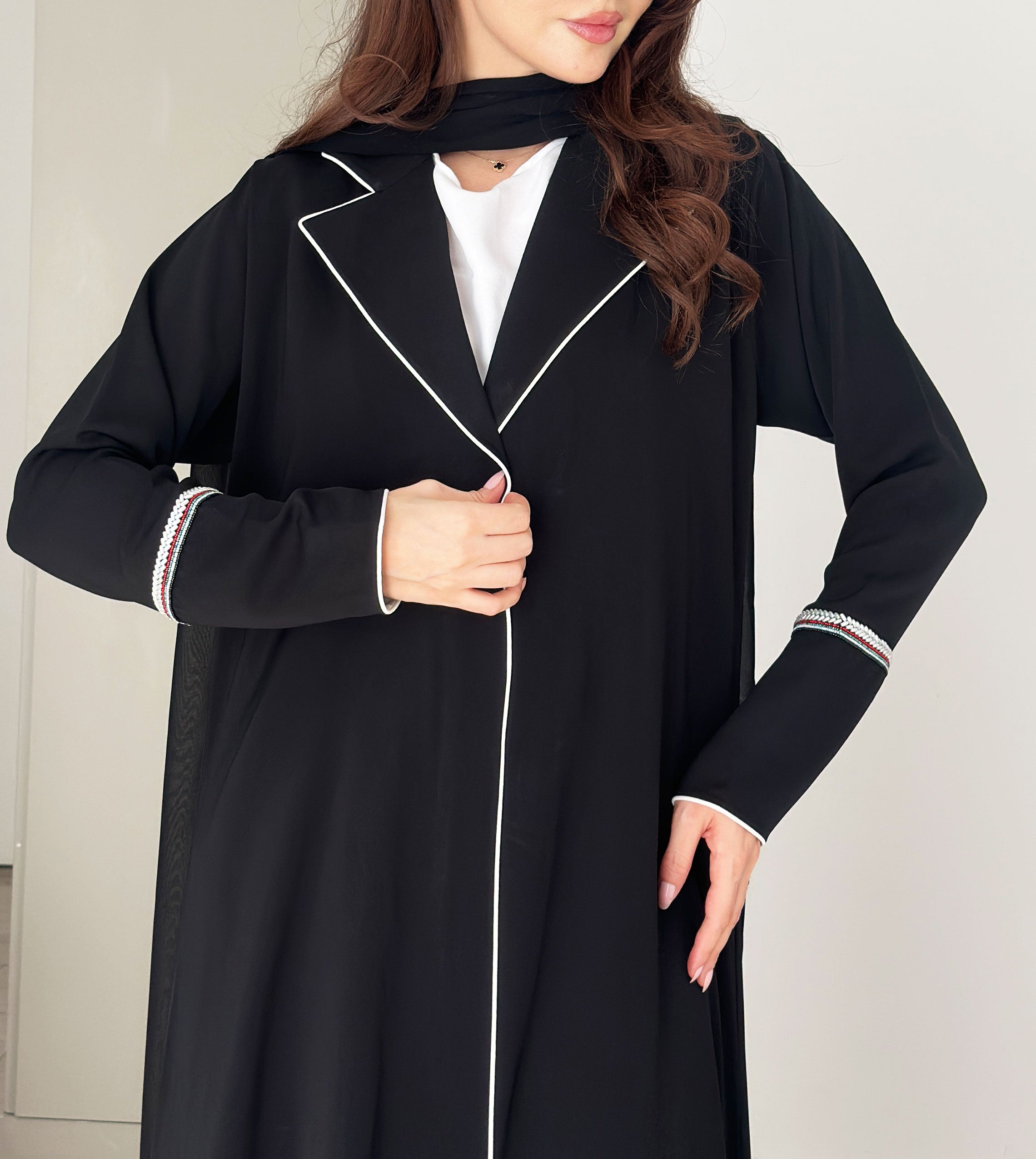 احتفلي بالأناقة الإماراتية مع العباية الفاخرة من قماش ندى، مزينة بتطريز مستوحاة من الإمارات، وشيلة مطرزة متناسقة. إطلالة مثالية لليوم الوطني Black abaya from Nada Fabric, adorned with Emirati-inspired embroidery and a matching embroidered sheila. The perfect look for National Day.