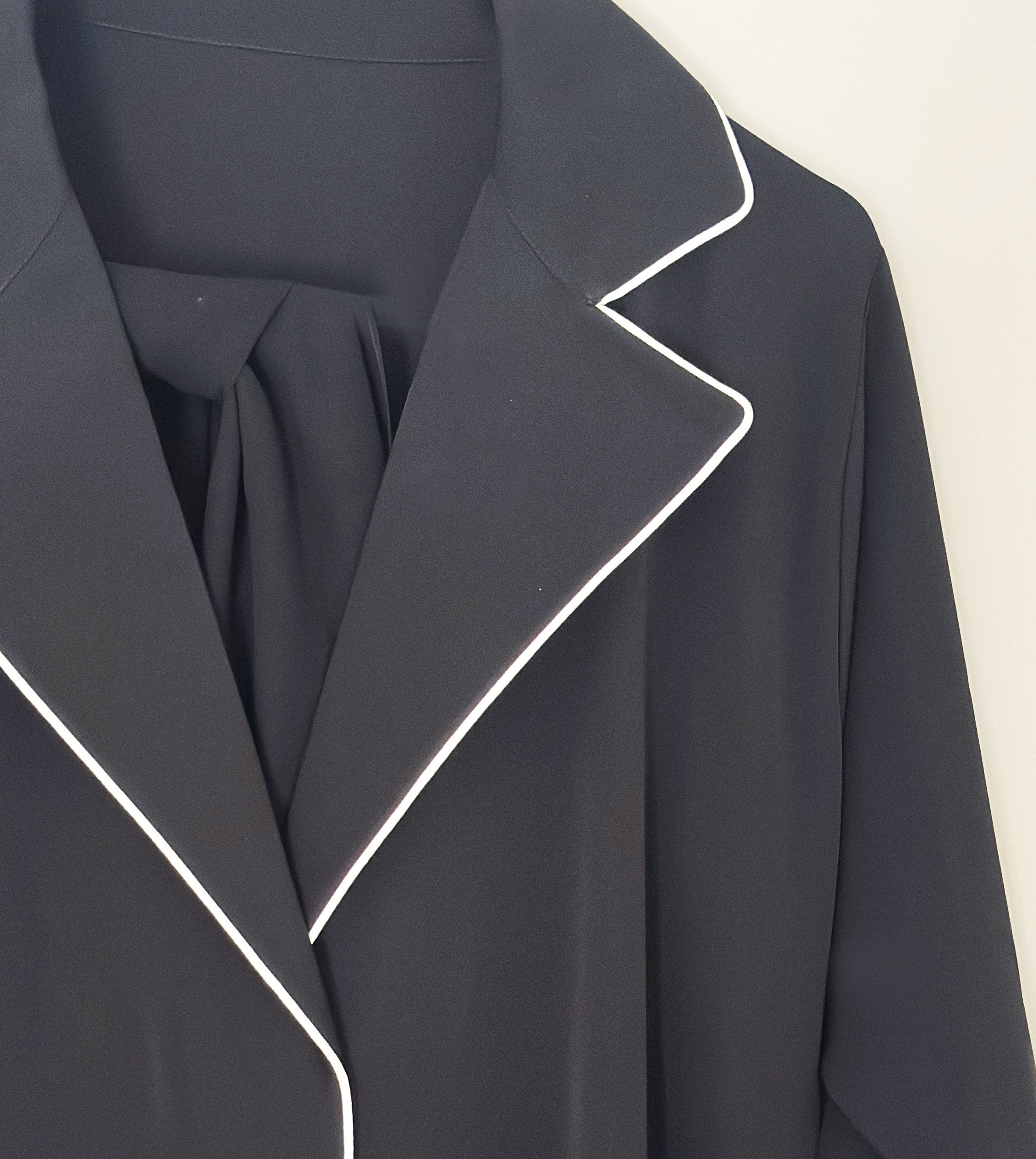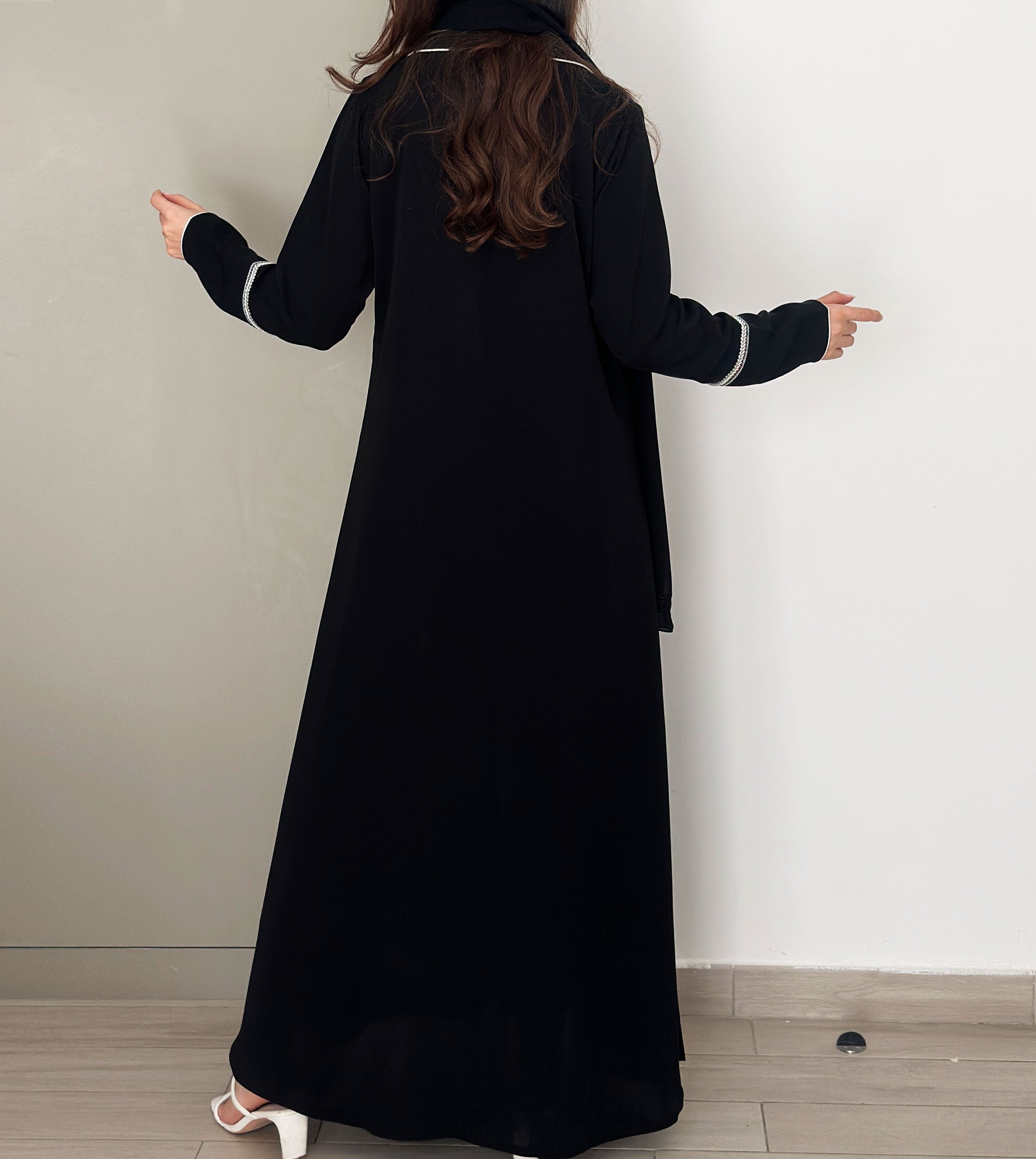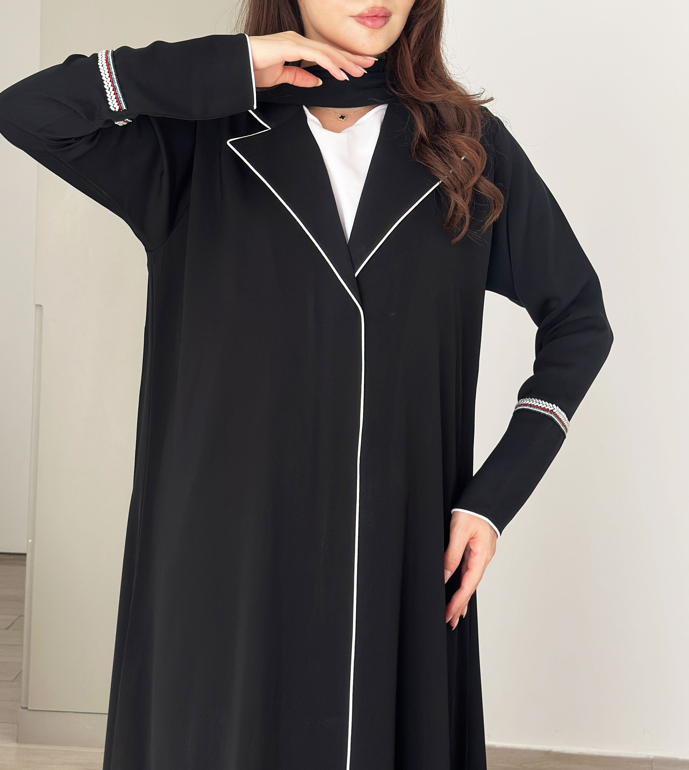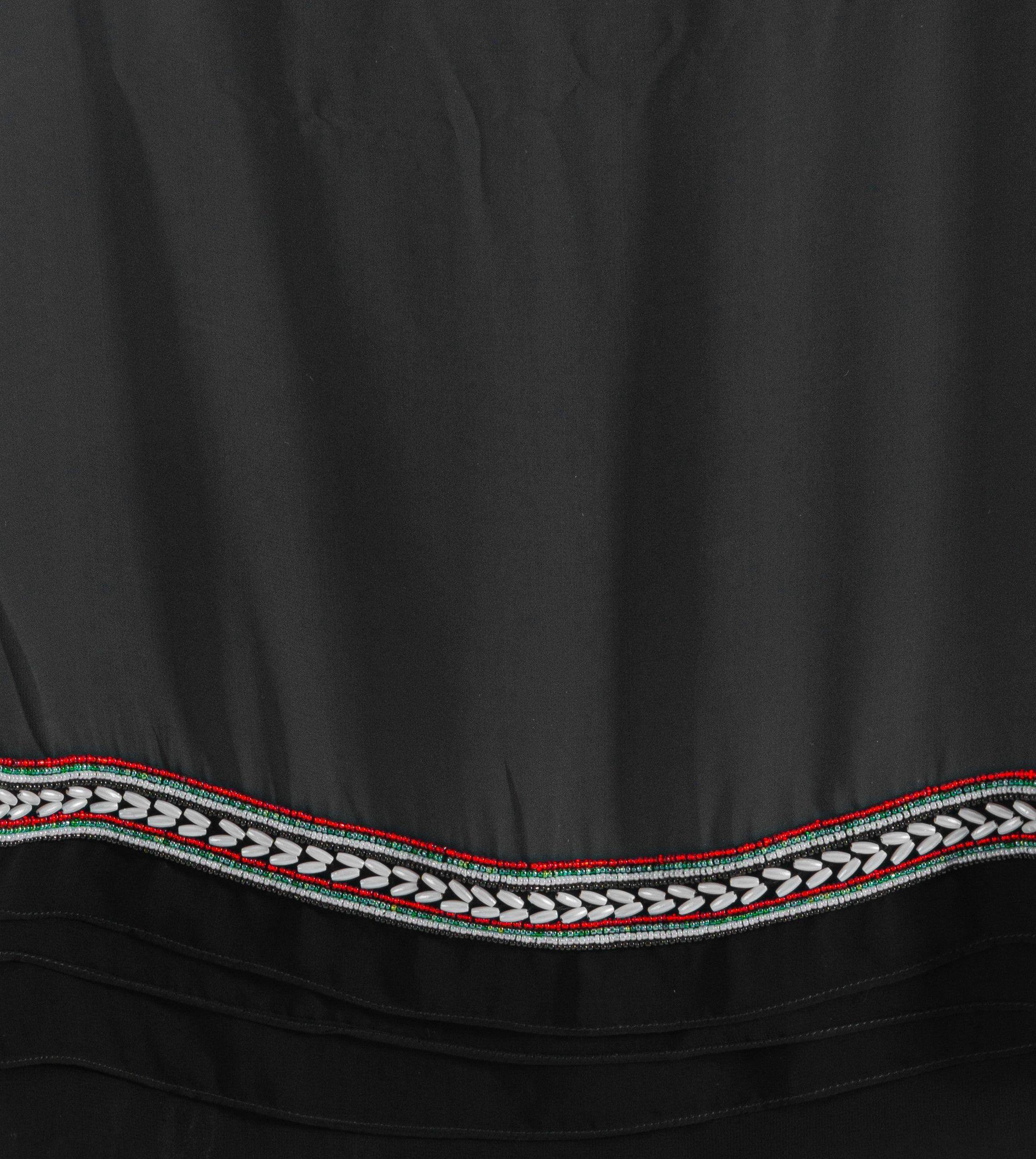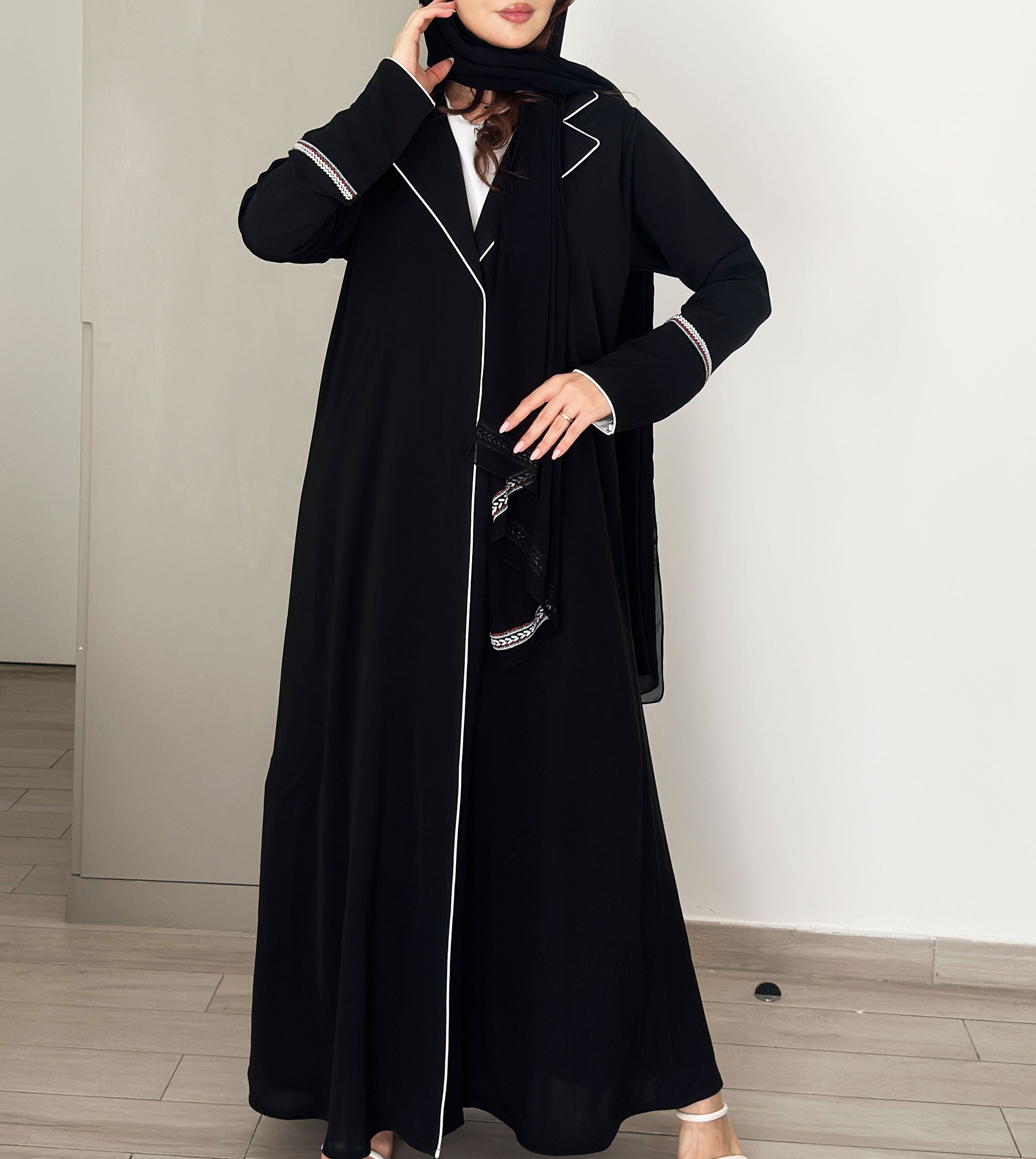 احتفلي بالأناقة الإماراتية مع العباية الفاخرة من قماش ندى، مزينة بتطريز مستوحاة من الإمارات، وشيلة مطرزة متناسقة. إطلالة مثالية لليوم الوطني Black abaya from Nada Fabric, adorned with Emirati-inspired embroidery and a matching embroidered sheila. The perfect look for National Day.