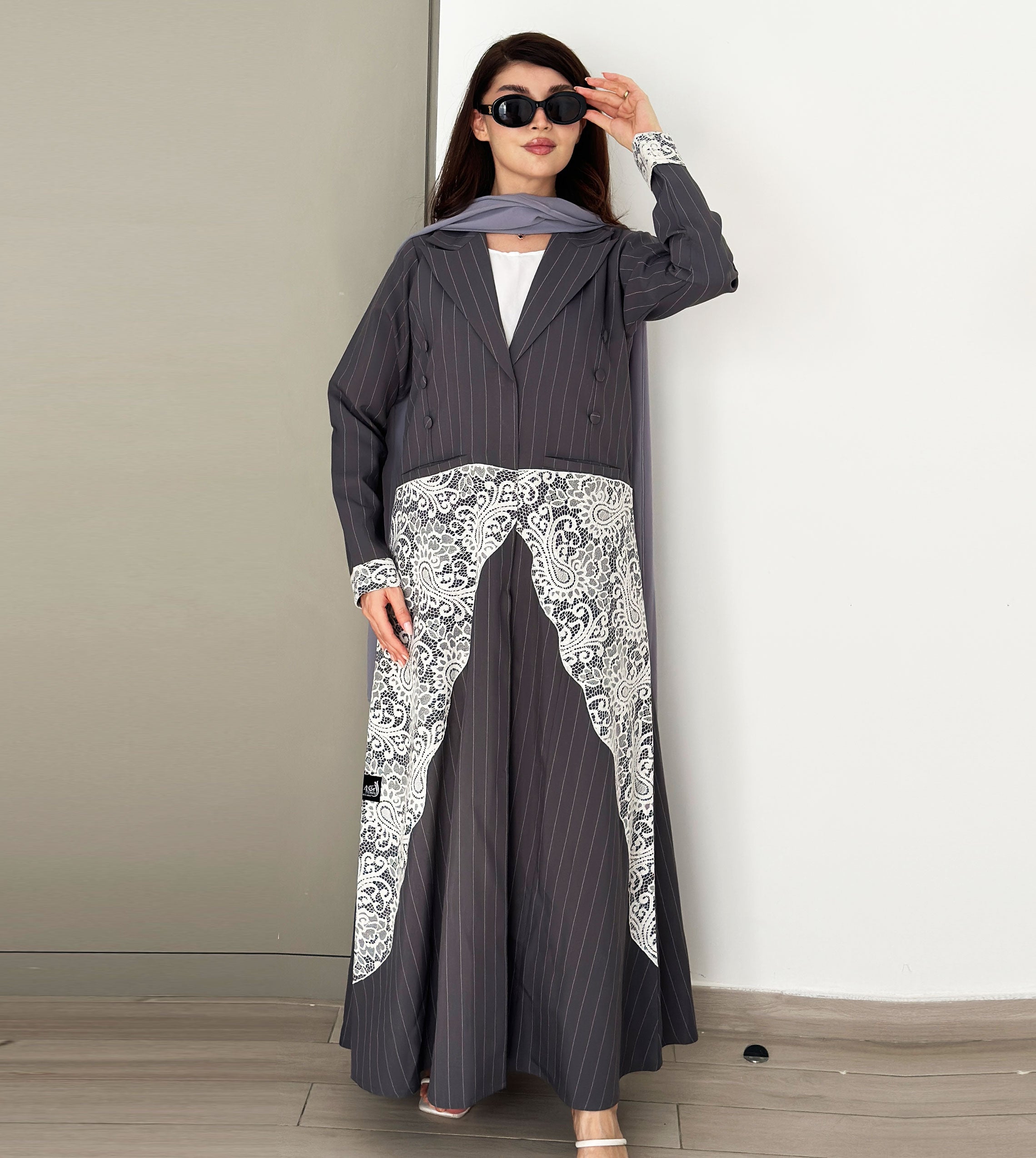 Stylish embellished grey blazer featuring a refined dentil design, functional pockets, and elegant button detailing سترة رمادية أنيقة مزينة بتصميم دانتيل أنيق، وجيوب عملية، وأزرار أنيقة  Perfect for modern modest fashion with a touch of class